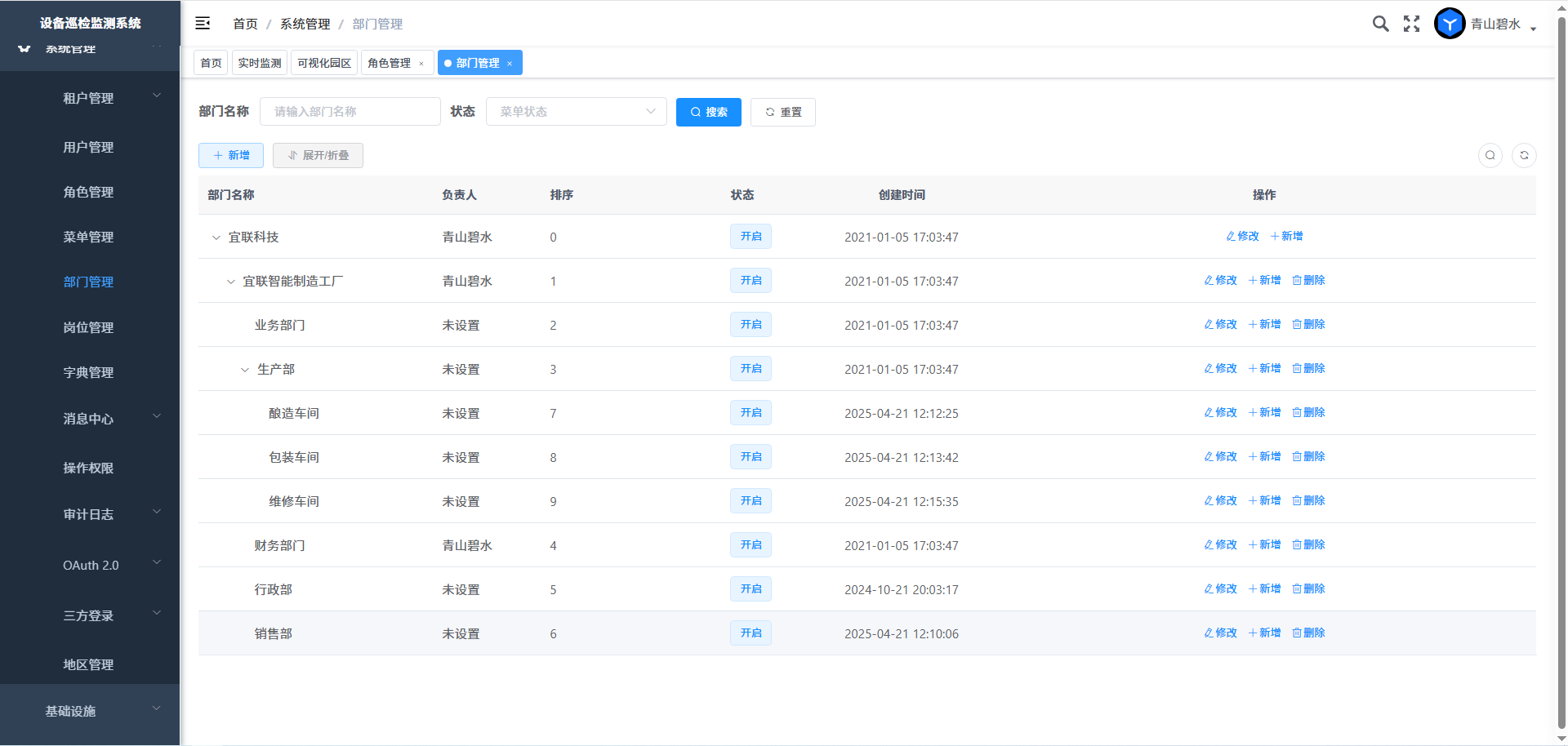 展开左边“系统管理”菜单,展开子菜单,点击“部门管理”,则打开部门管理界面添加修改园区的各管理部门,如下图: