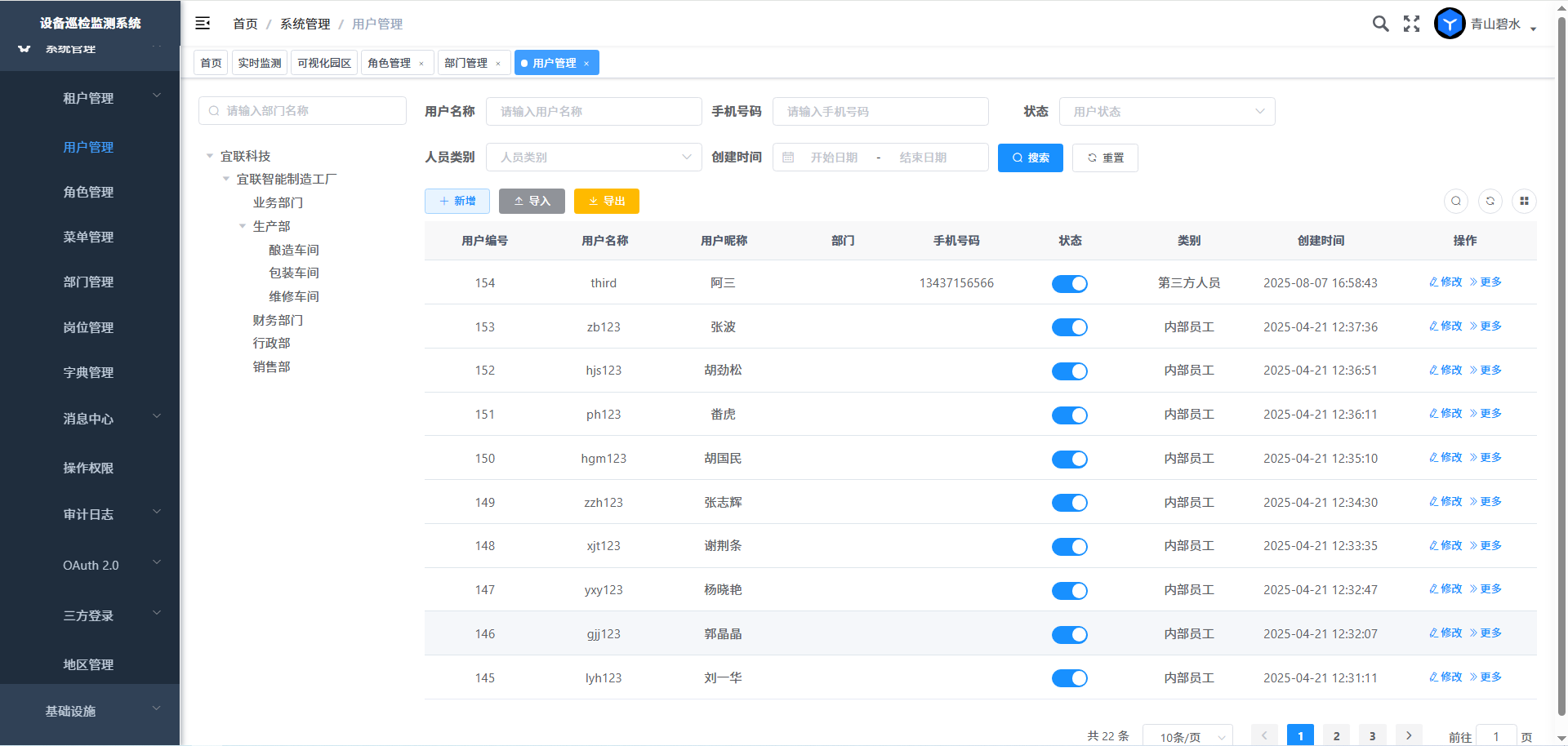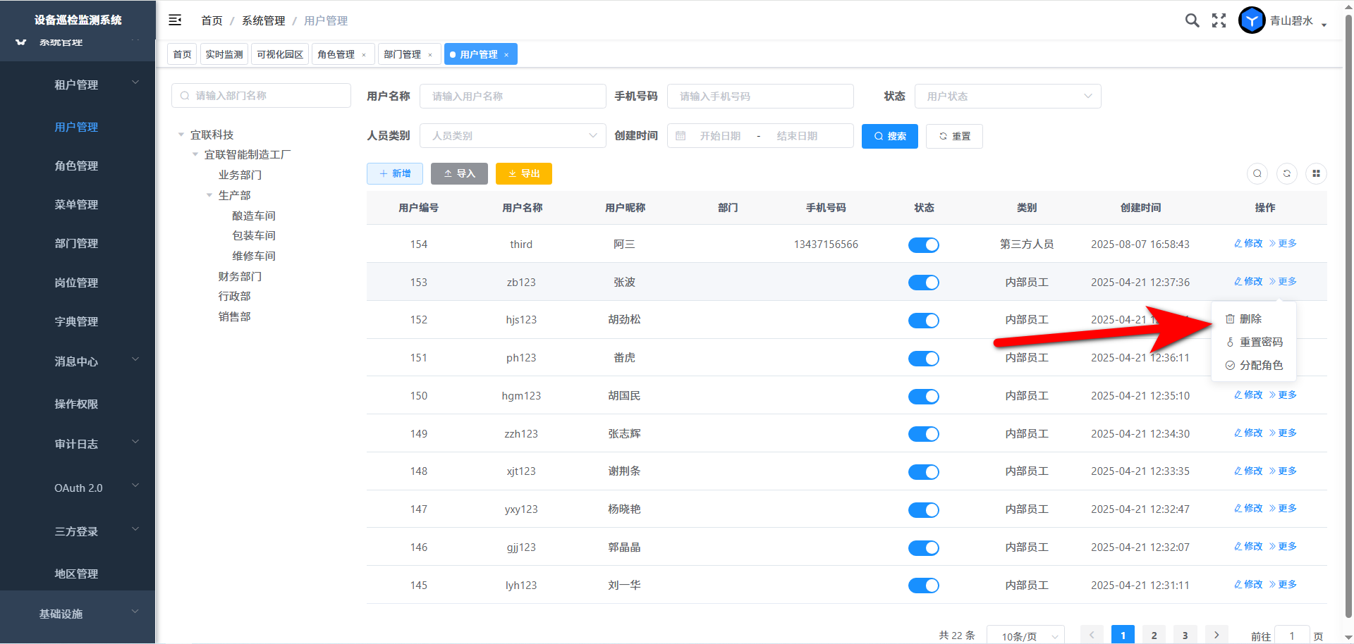 在添加用户信息同时设置用户所属部门、角色、系统登陆密钥信息,列表操作栏,点击更多则弹出下拉菜单可以删除用户、重置所选用户的系统登录密码、设置用户角色选项。