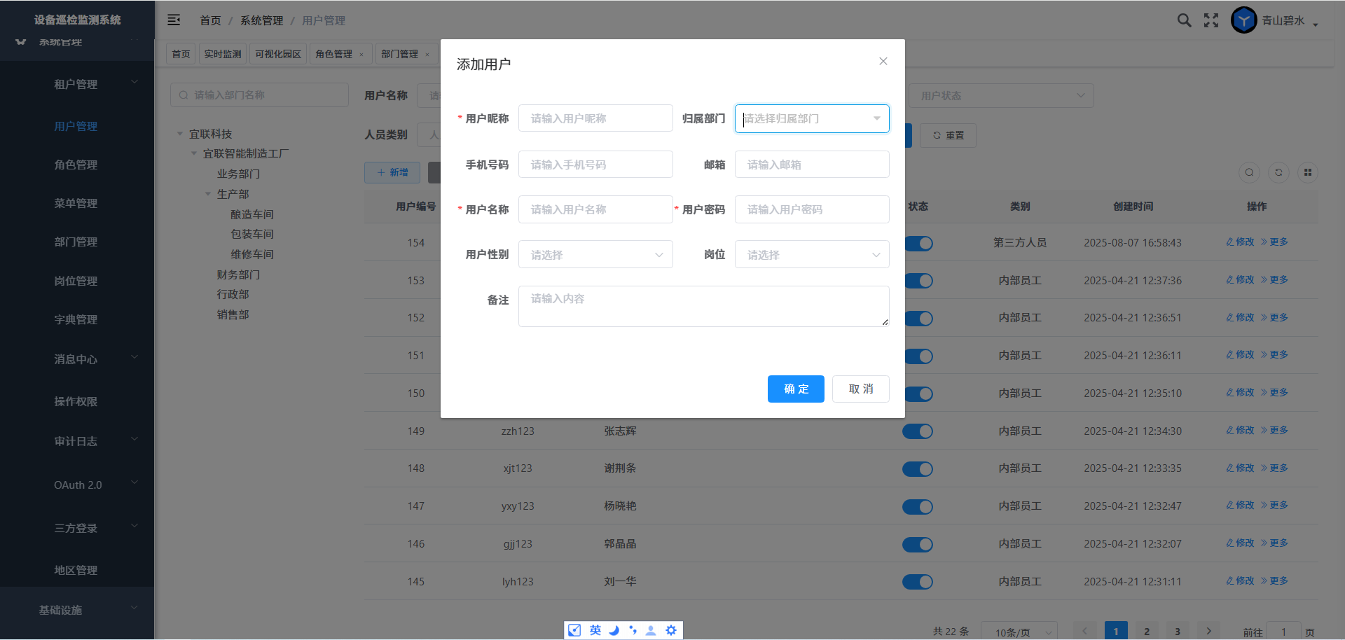 点击新增按钮打开窗口填写新增部门信息,点击左边的“用户管理”菜单打开用户管理界面