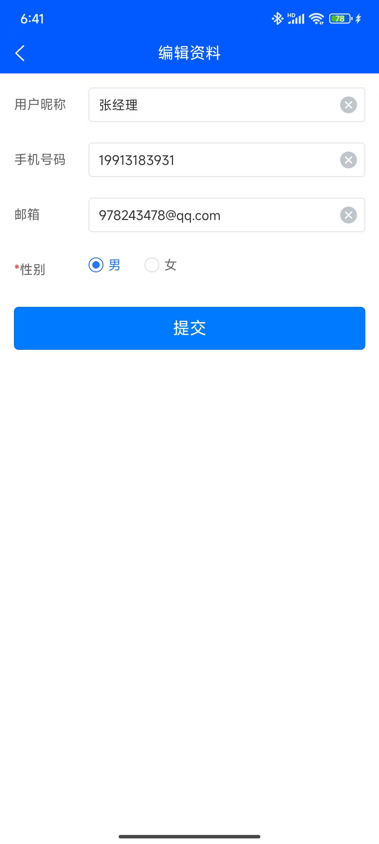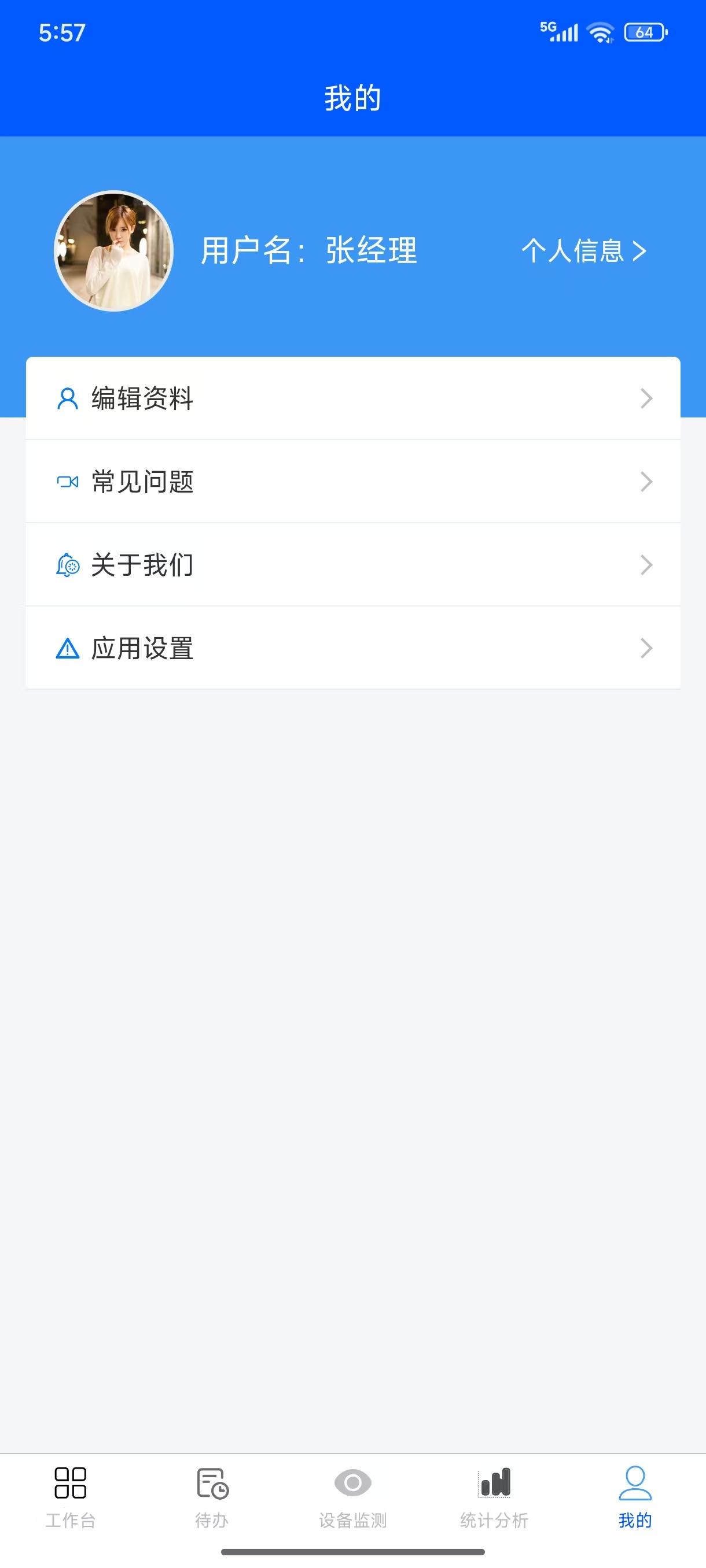 移动端APP上的“我的”部分,提供了登录用户的信息展示、登录用户个人账户密码修改、个人资料管理、App操作帮助、退出移动端登录的功能。