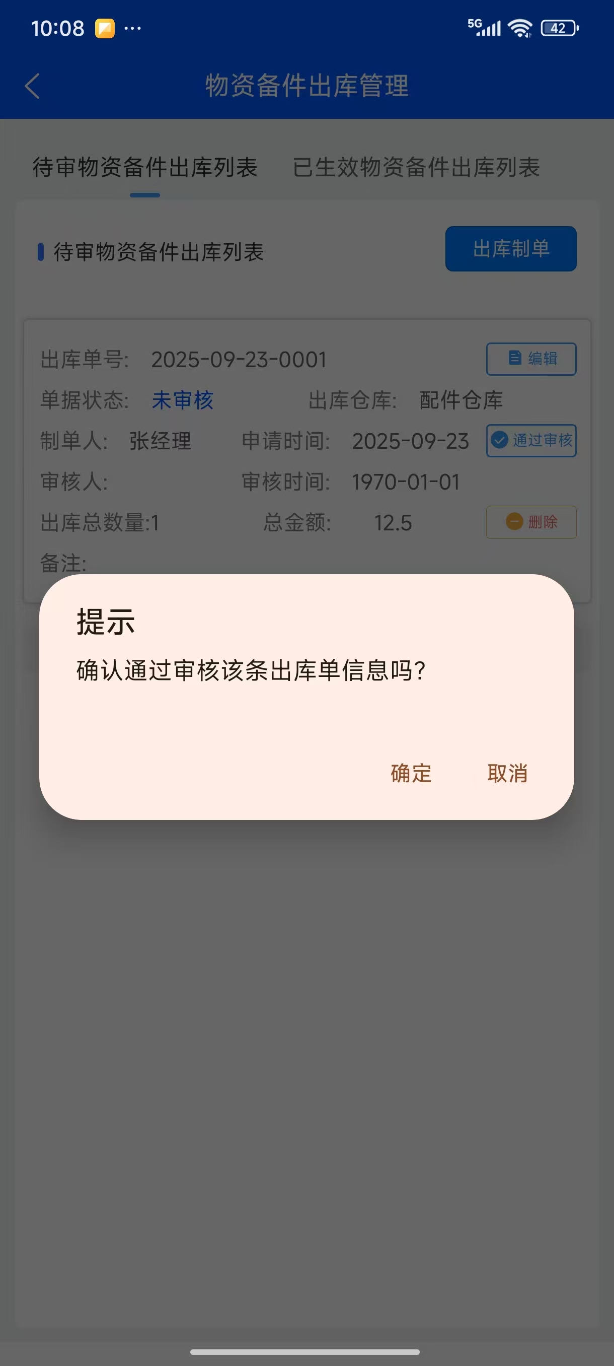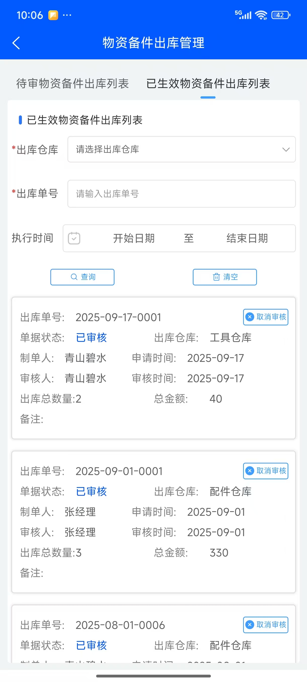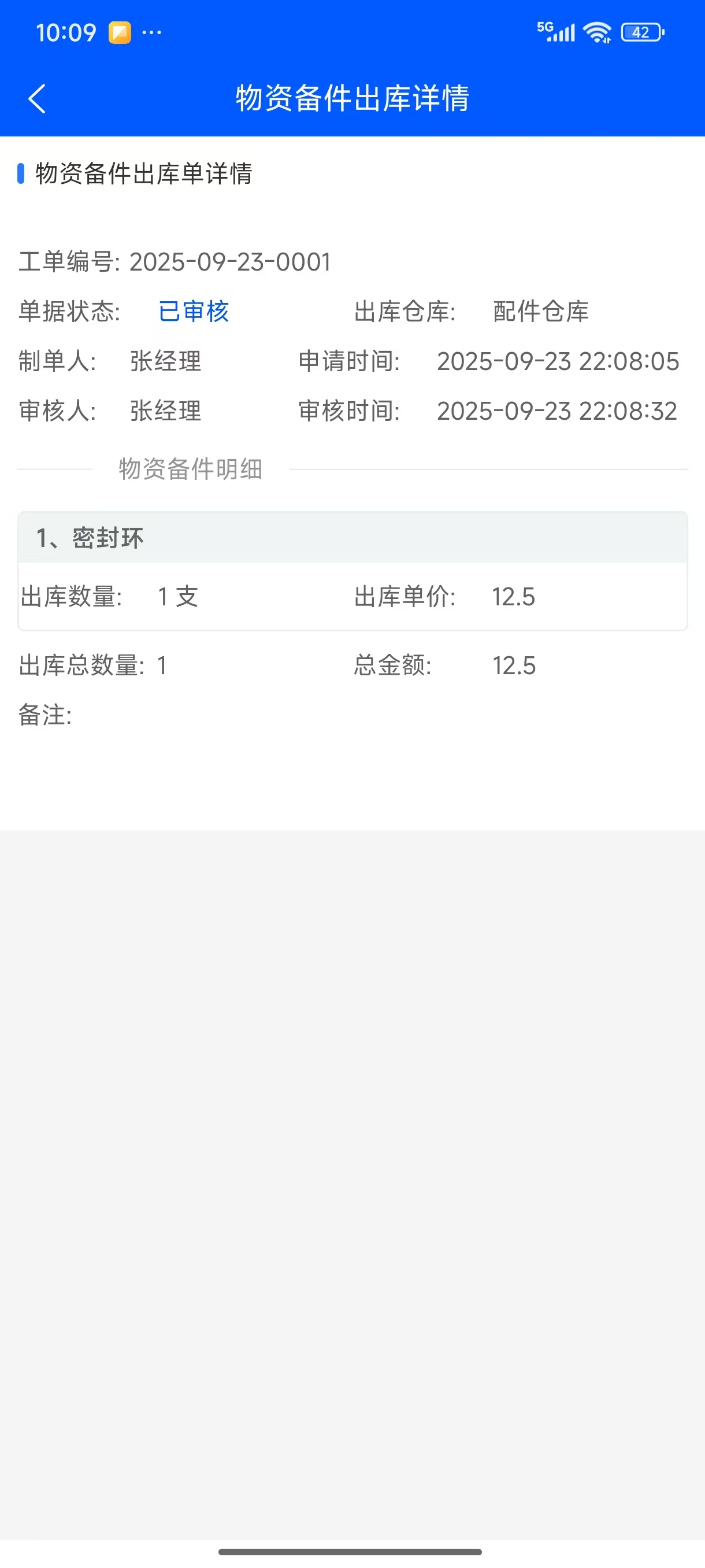 添加物资备件明细后,保存生成待审出库单,点击”审核”按钮,通过审核物资备件出库单出库成功。物资备件出库单审核通过后在“已生效物资备件出库列表”显示,点击物资备件出库单,打开详情页面可以产物资备件出库单详情。