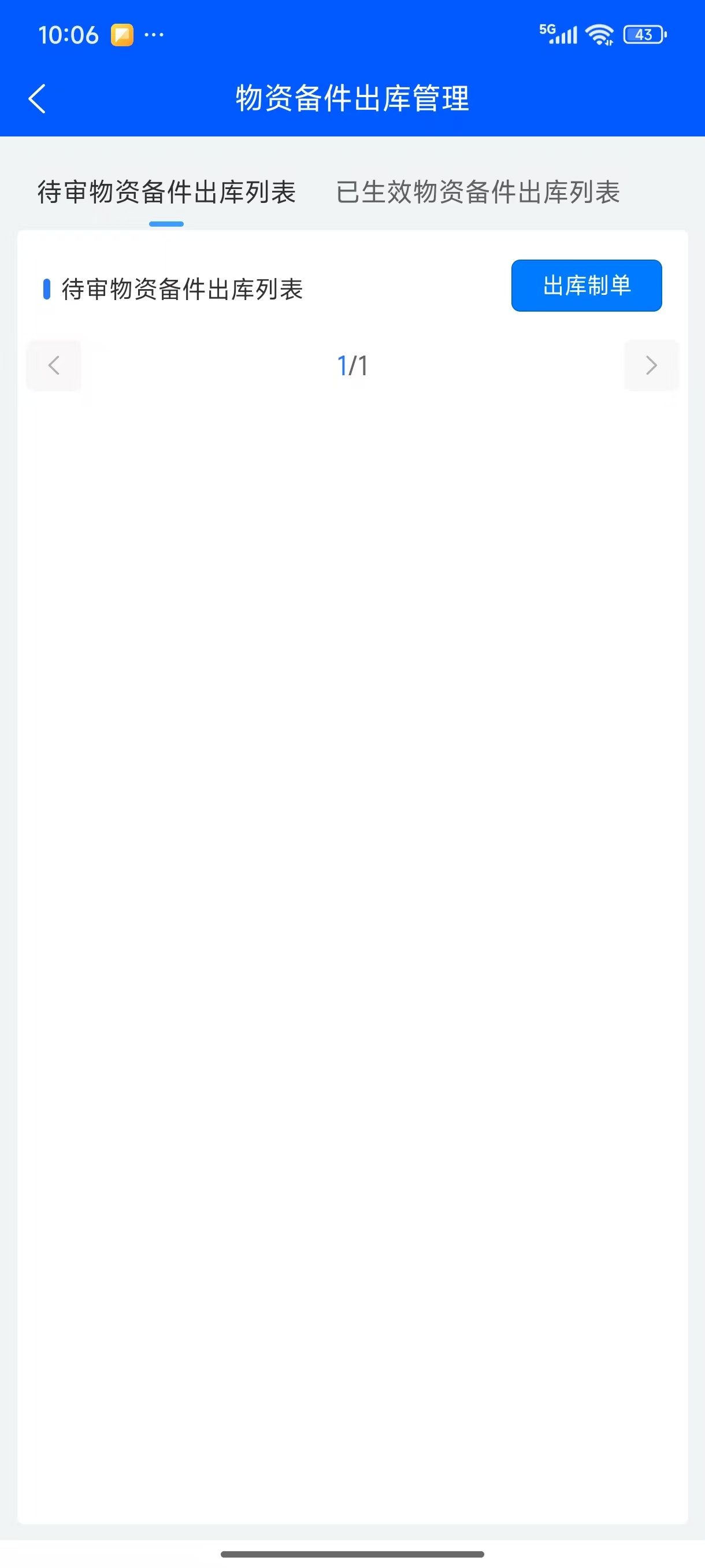 工作区主操作界面点击“备件出库”图标打开物资备件出库操作界面,有“待审物资备件出库列表”、“已生效物资备件出库列表”两个tab页。