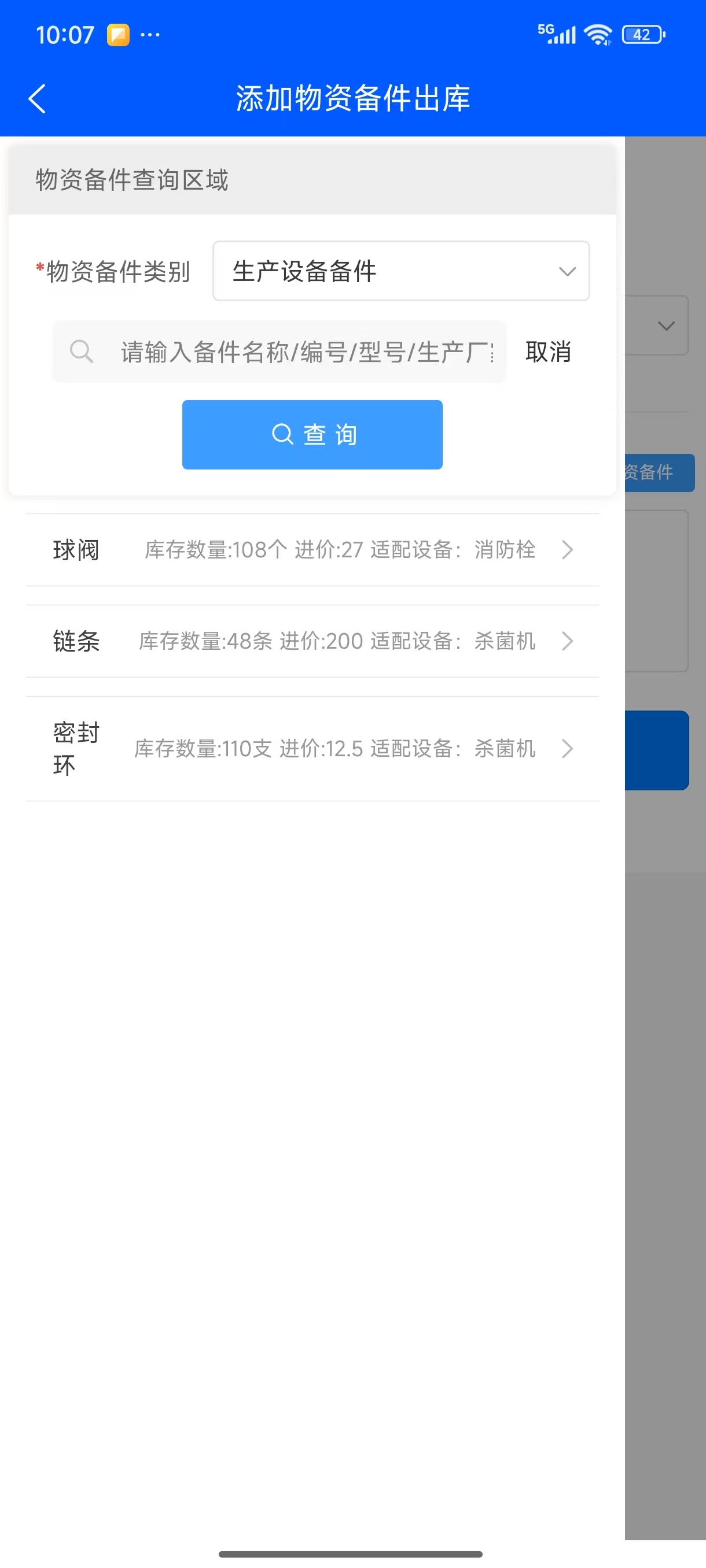 在“待审物资备件出库列表”界面点击“出库制单”按钮打开物资备件出库操作界面,选择出库仓库,点击“选择物资备件”按钮打开选择物资备件