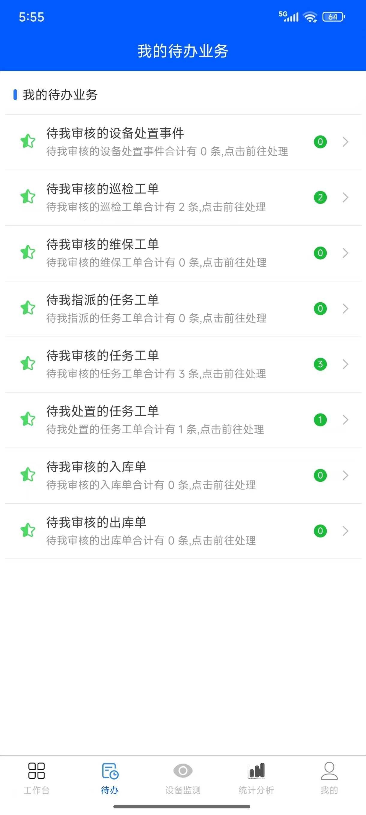 点击主操作界面下方“待办”导航图标,打开界面列表显示当前登录用户所有的待办任务通知列表、待审批事件、待处置工单列表,点击不同的条目进入不同功能的处置或审批操作界面。