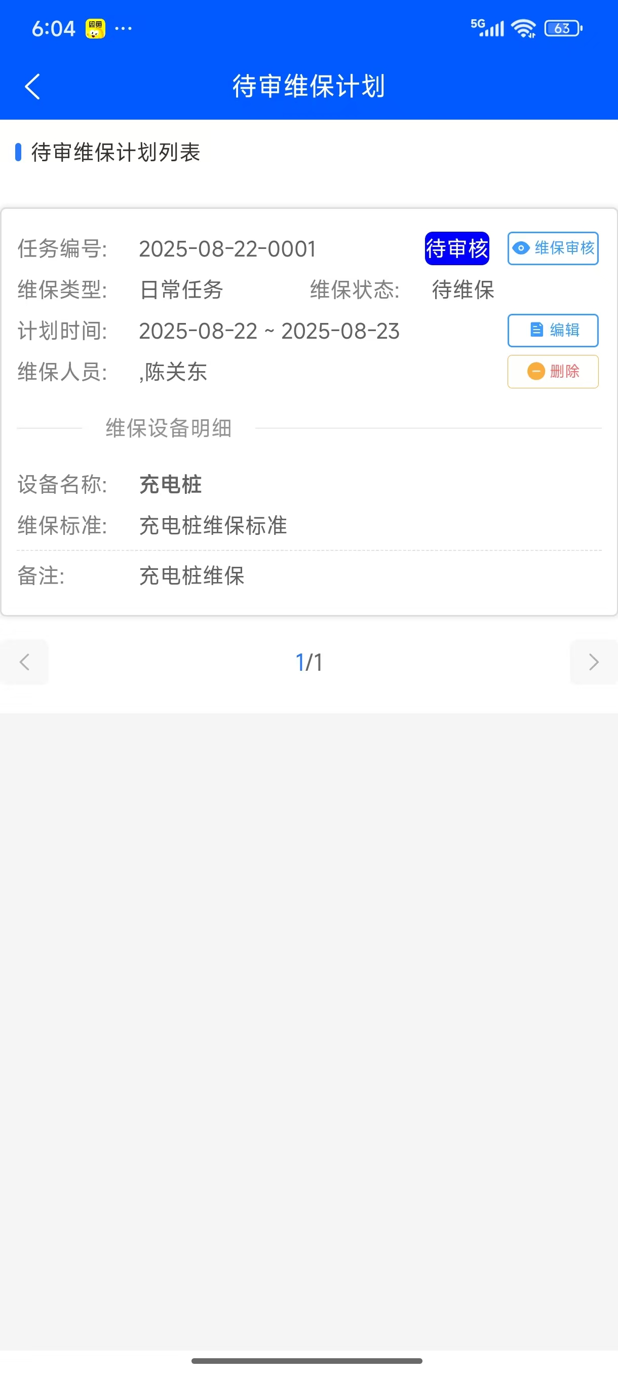 维保计划保存成功,显示在“待审维保计划”tab标签页面,待审维保计划列表显示所生成的设备维保计划单,单据状态为待审核状态,在此界面可以对维保计划点击“编辑”按钮进行编辑操作和点击“删除”按钮删除设备维保计划。点击“维保审核”按钮,则打开设备维保计划审核界面,