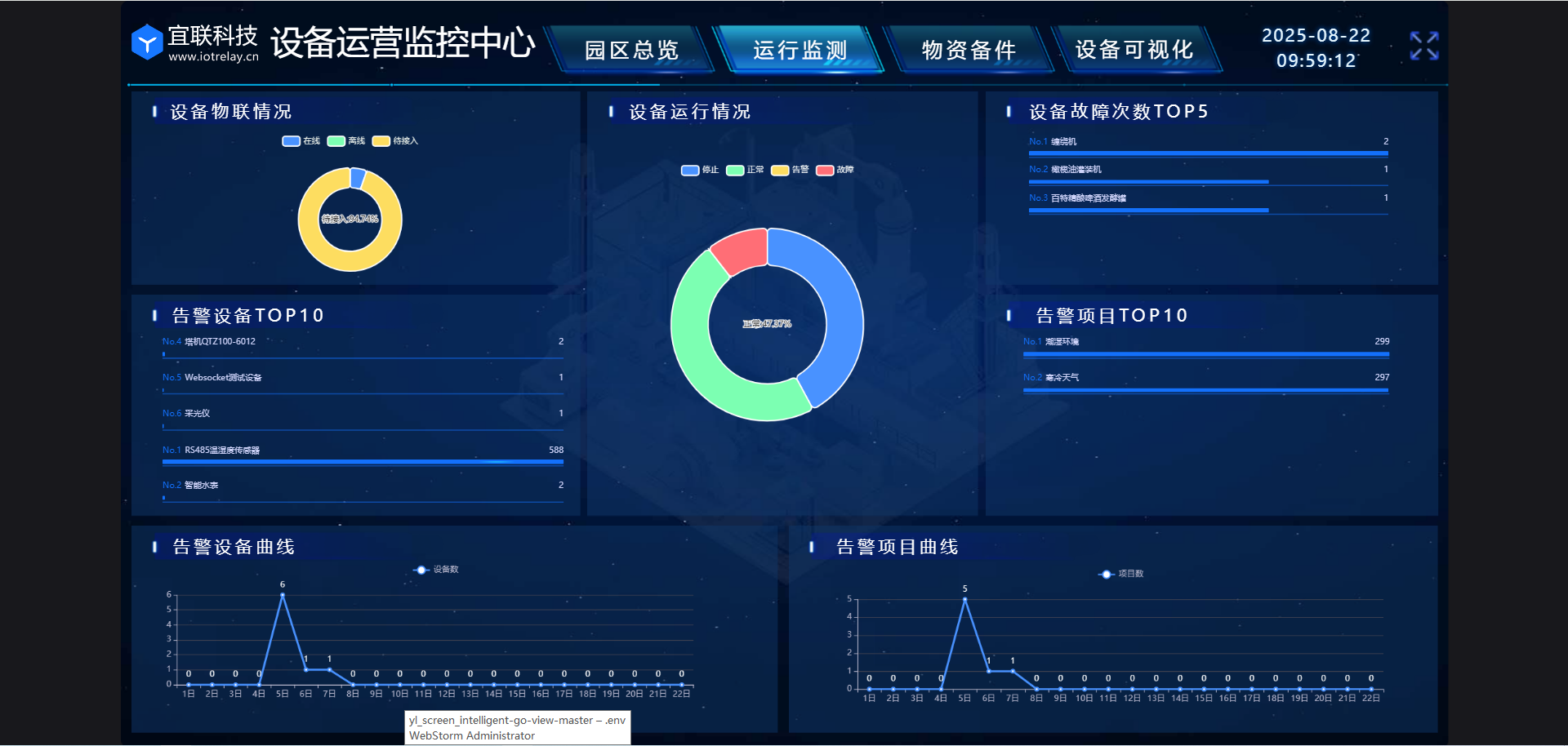 将企业运营管理数据可视化展示,实现“一图总览“园区发展全貌,宜联设备巡检监测系统平台针对企业调度中心、会议中心、监控中心(通常是园区的屏幕墙)提供了领导驾驶舱功能,供园区领导、指挥监控中心使用。宜联设备巡检监测系统可视化大屏主要包含“园区总览”、“运行监测”、“物资备件”、“设备可视化”四大部分: