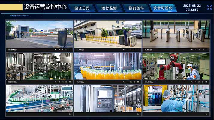 可视化园区:通过摄像头视频监控设备全方位监控园区各个关键区域和设备设施,生产现场的视频监控监测,实现监控、调阅回溯现场生产过程和设备操作情况与设备运行情况、设备外观环境,赋能工厂、园区设备的科学管理。