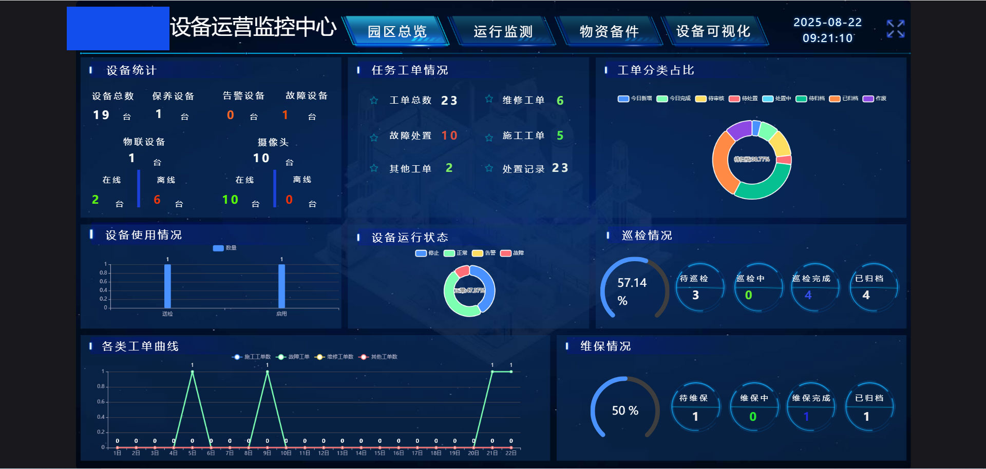 将企业运营管理数据可视化展示,实现“一图总览“园区发展全貌,宜联设备巡检监测系统平台针对企业调度中心、会议中心、监控中心(通常是园区的屏幕墙)提供了领导驾驶舱功能,供园区领导、指挥监控中心使用。宜联设备巡检监测系统可视化大屏主要包含“园区总览”、“运行监测”、“物资备件”、“设备可视化”四大部分: