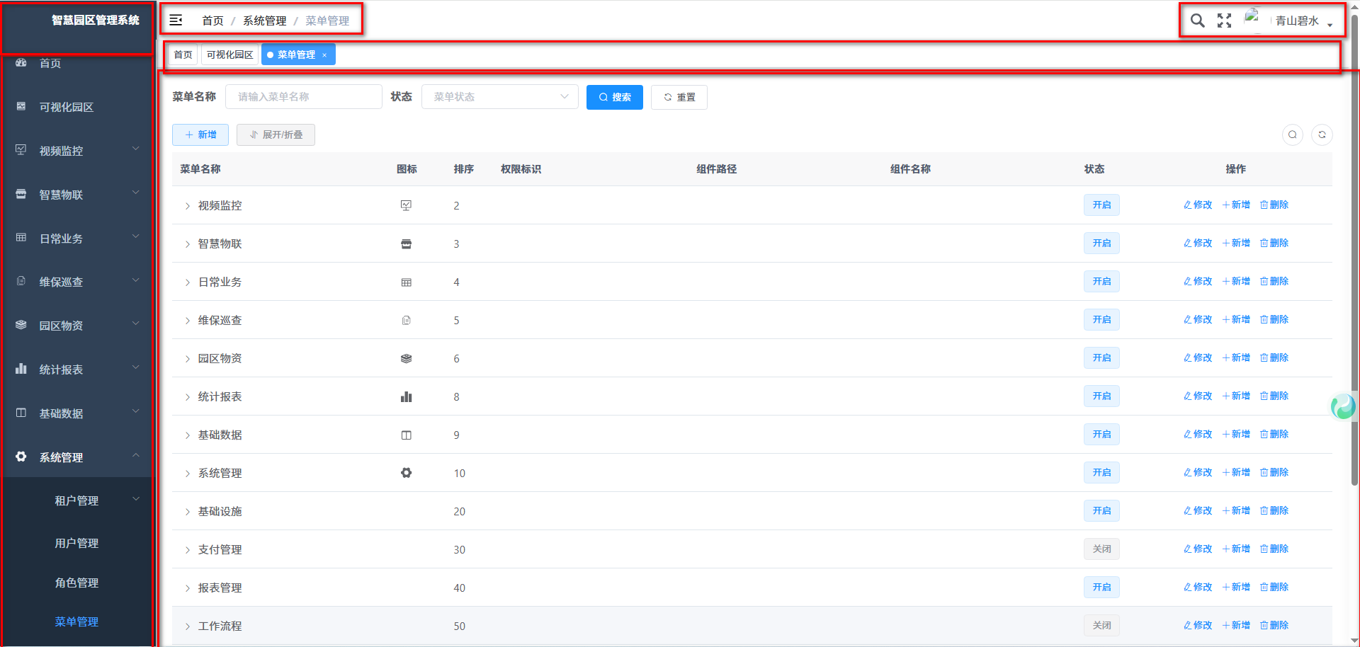 系统登陆后进入管理系统操作界面,此操作界面按上图划分“管理系统名称、logo”、“左边功能操作折叠菜单”、右边上部“面包屑”、“登录用户信息”、“导航tob标签”、“正文显示区域”6个区域