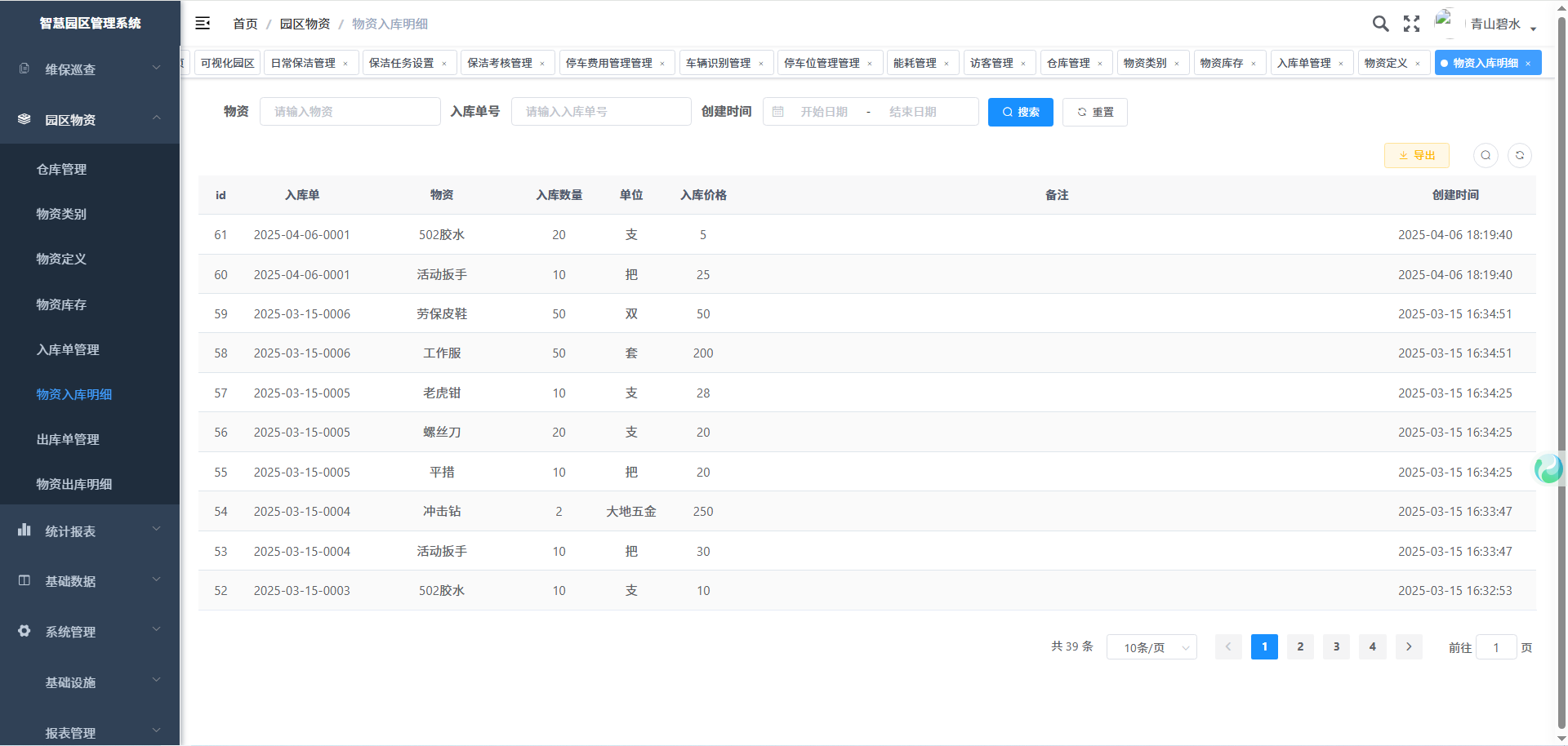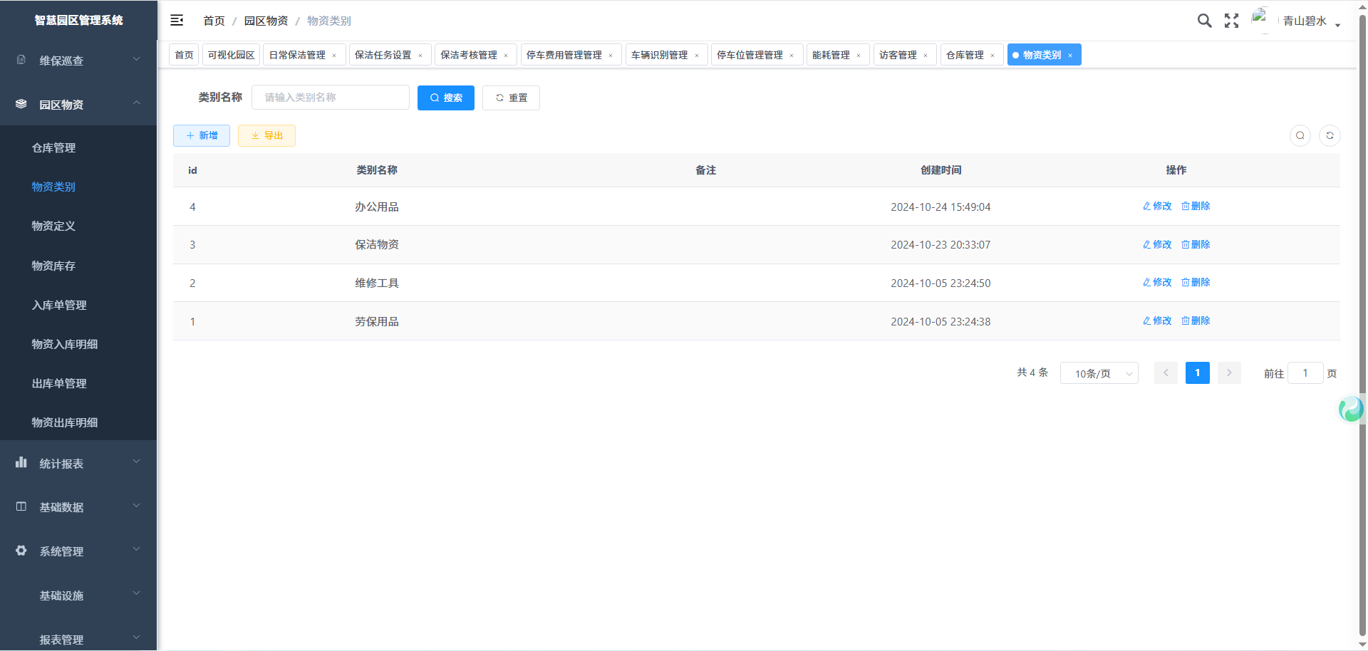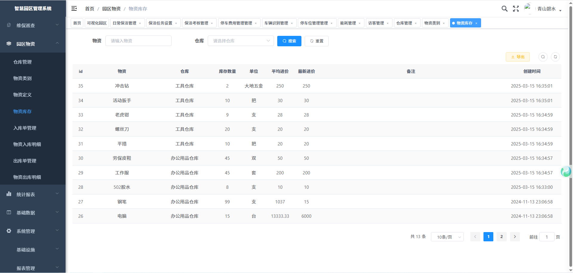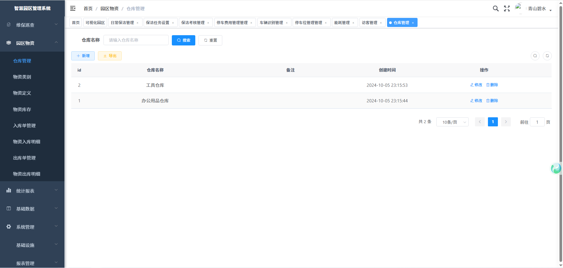 本系统为园区物资、配件流动管理提供了物资进销存功能,用于管理园区物资、材料流动情况。点击菜单园区物资展开子菜单,分别由“仓库管理”、“物资类别”、“物资库存”、“入库管理”、“出库管理”、“物资进出明细统计”组成。