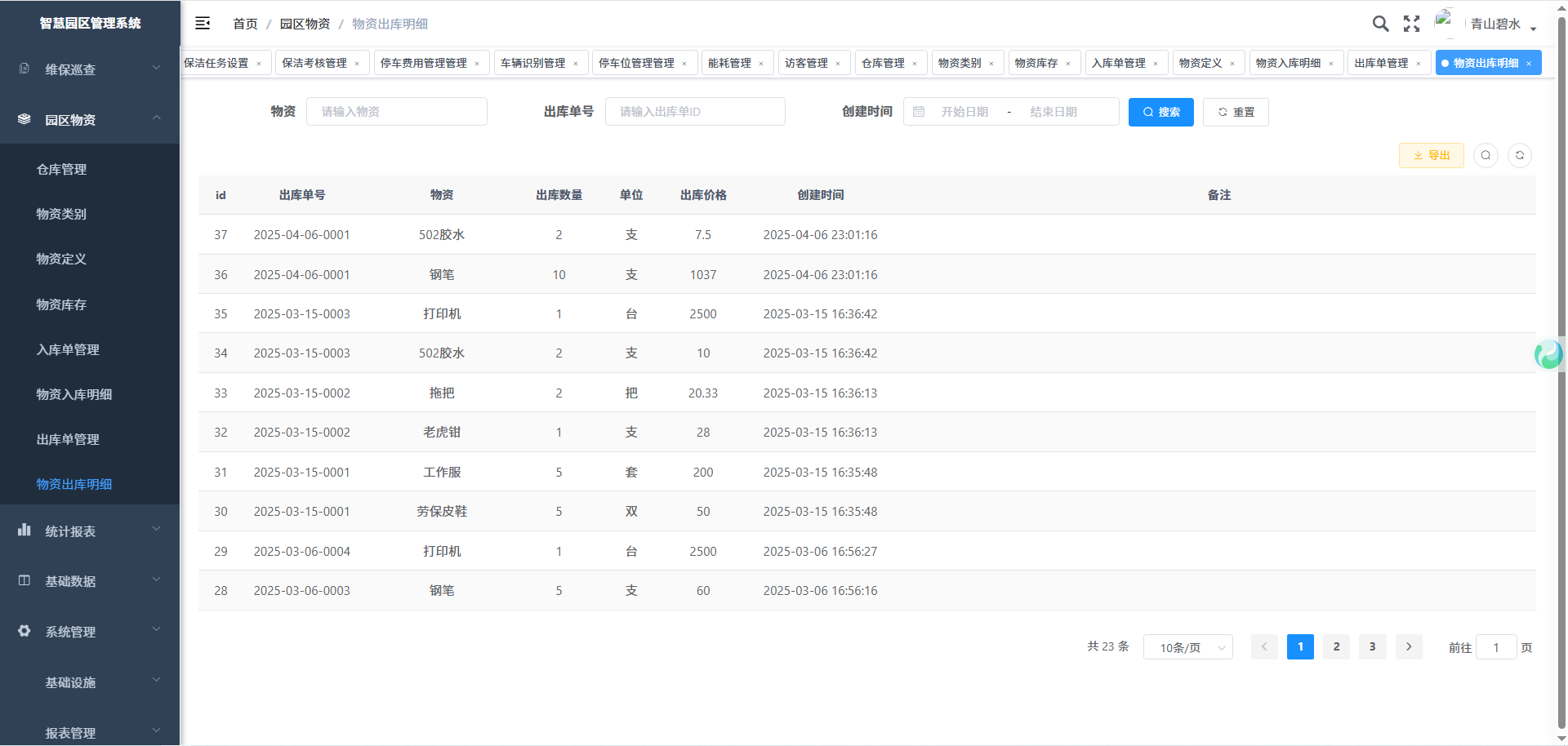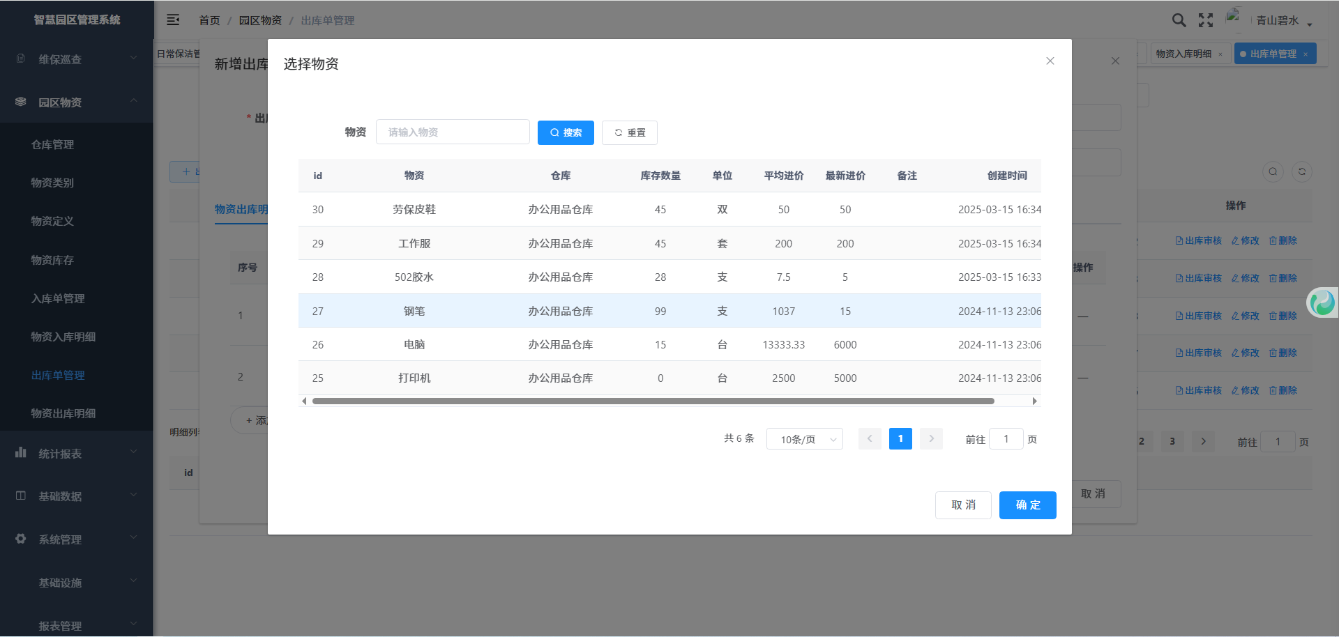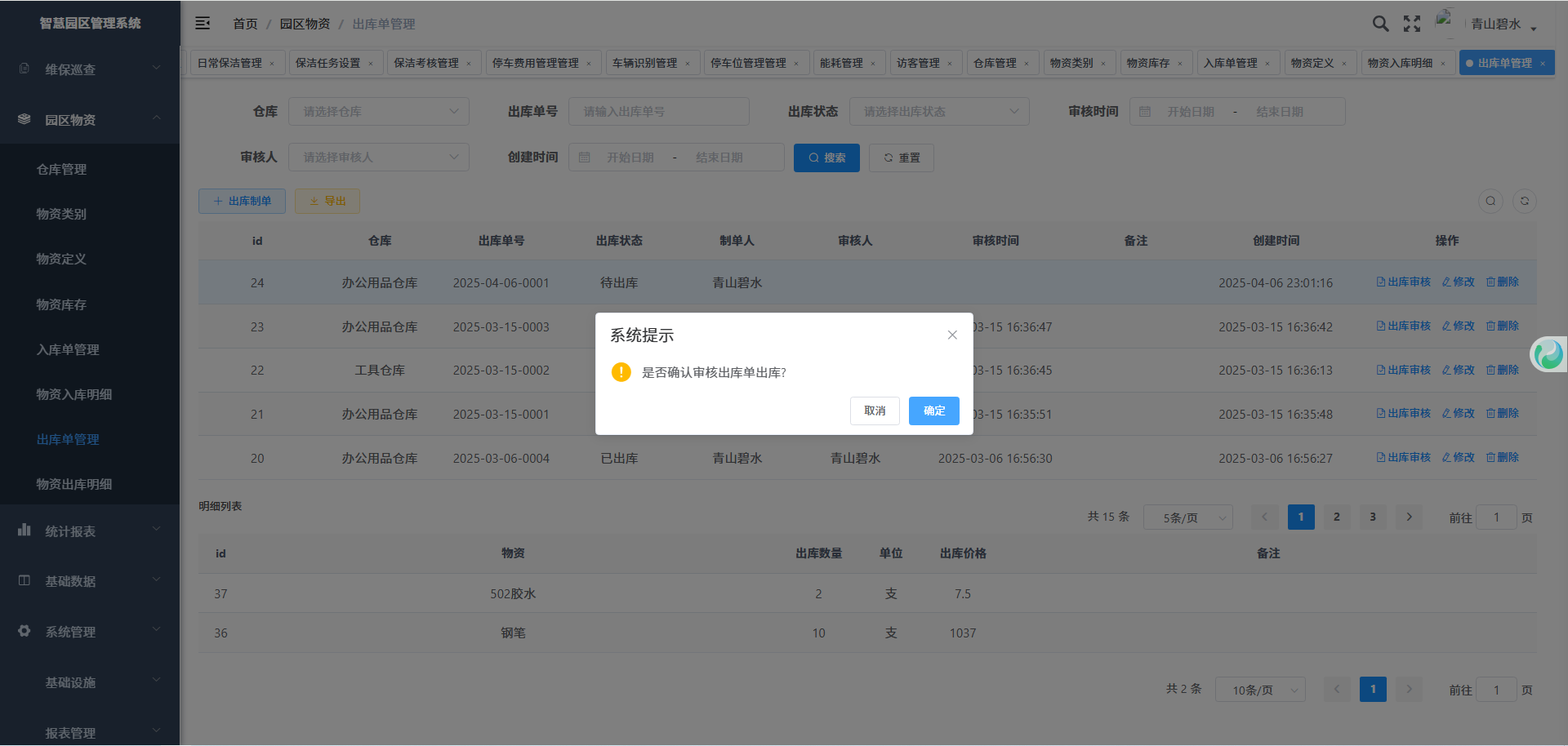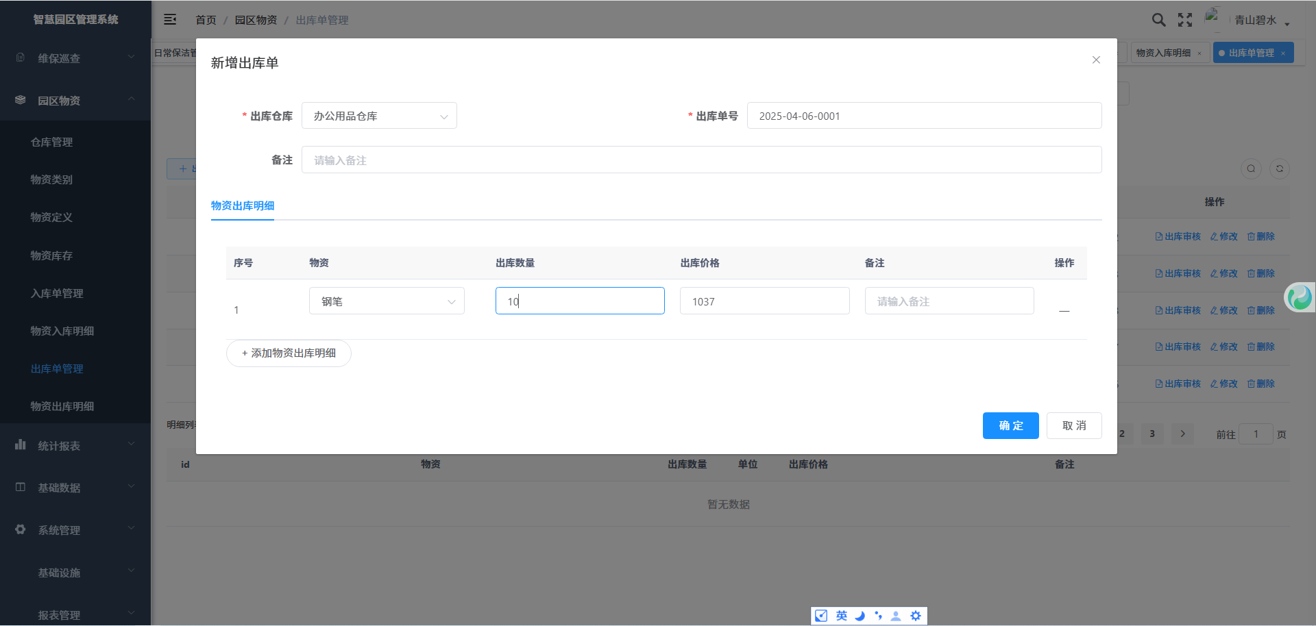 用于记录园区物资出库,物资出库流程是,先出库制单,选择物资明细,出库物资数量,保存制单成功,然后由有物资审核权限的人员出库审核出库,只有对出库单审核后,物资才会出库,库存数量扣减,出库后物资库存变动情况在库存管理里面体现。