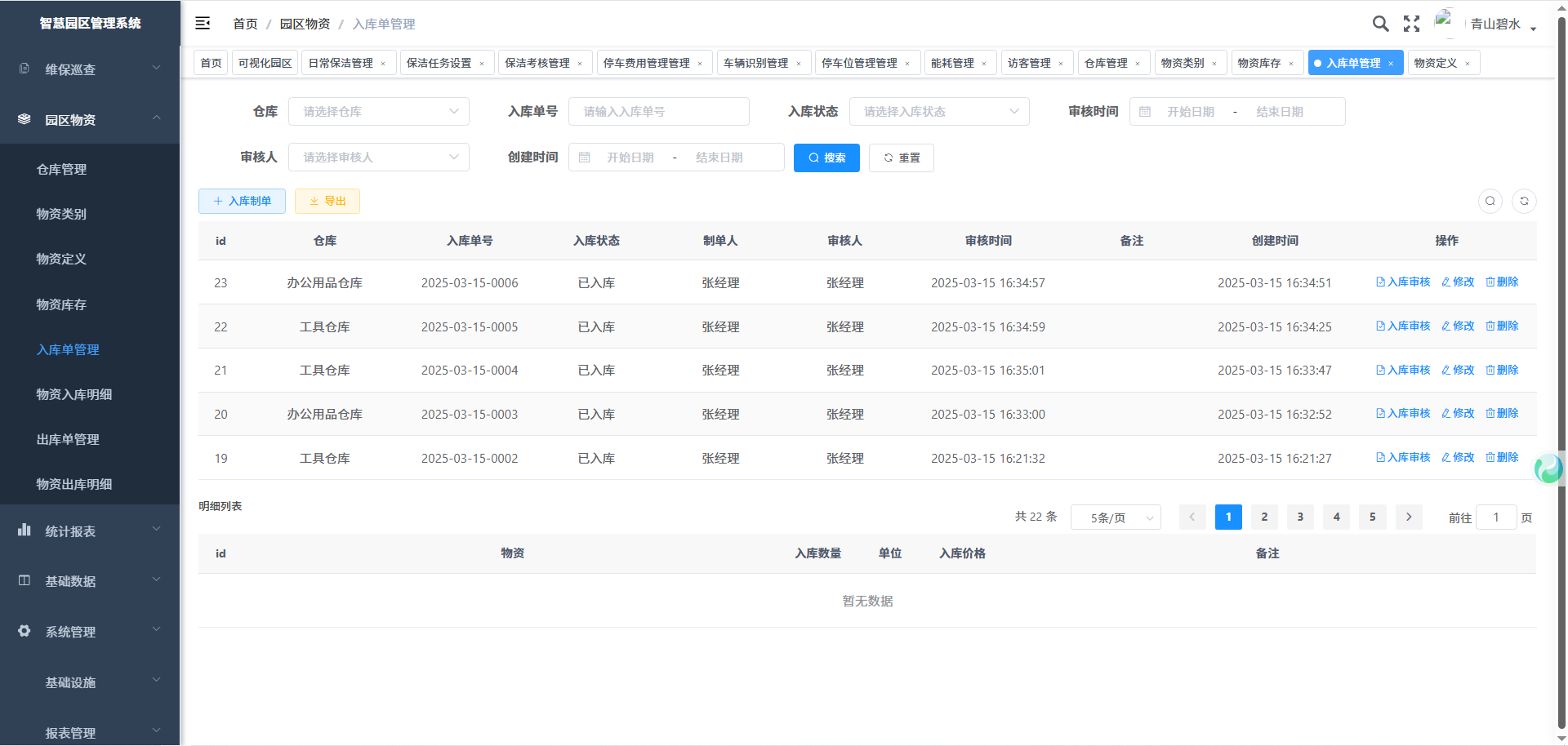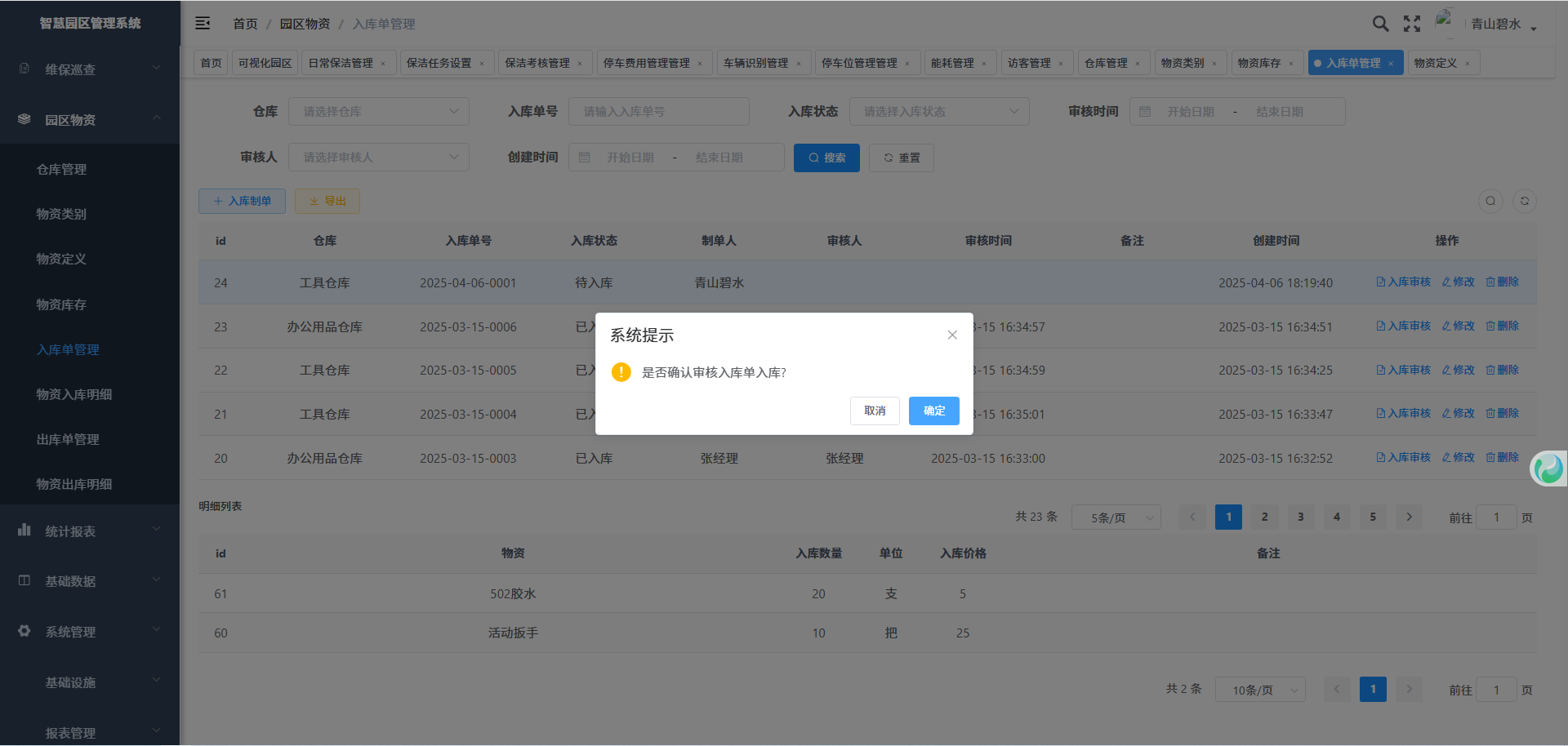用于记录园区物资入库,物资入库流程是,先入库制单,选择录入物资明细,物资入库价格、数量,保存制单成功,然后由有物资审核权限的人员入库审核入库,只有对入库单审核后,物资才会入库,库存数量增加,入库后物资库存变动情况在库存管理里面体现。
