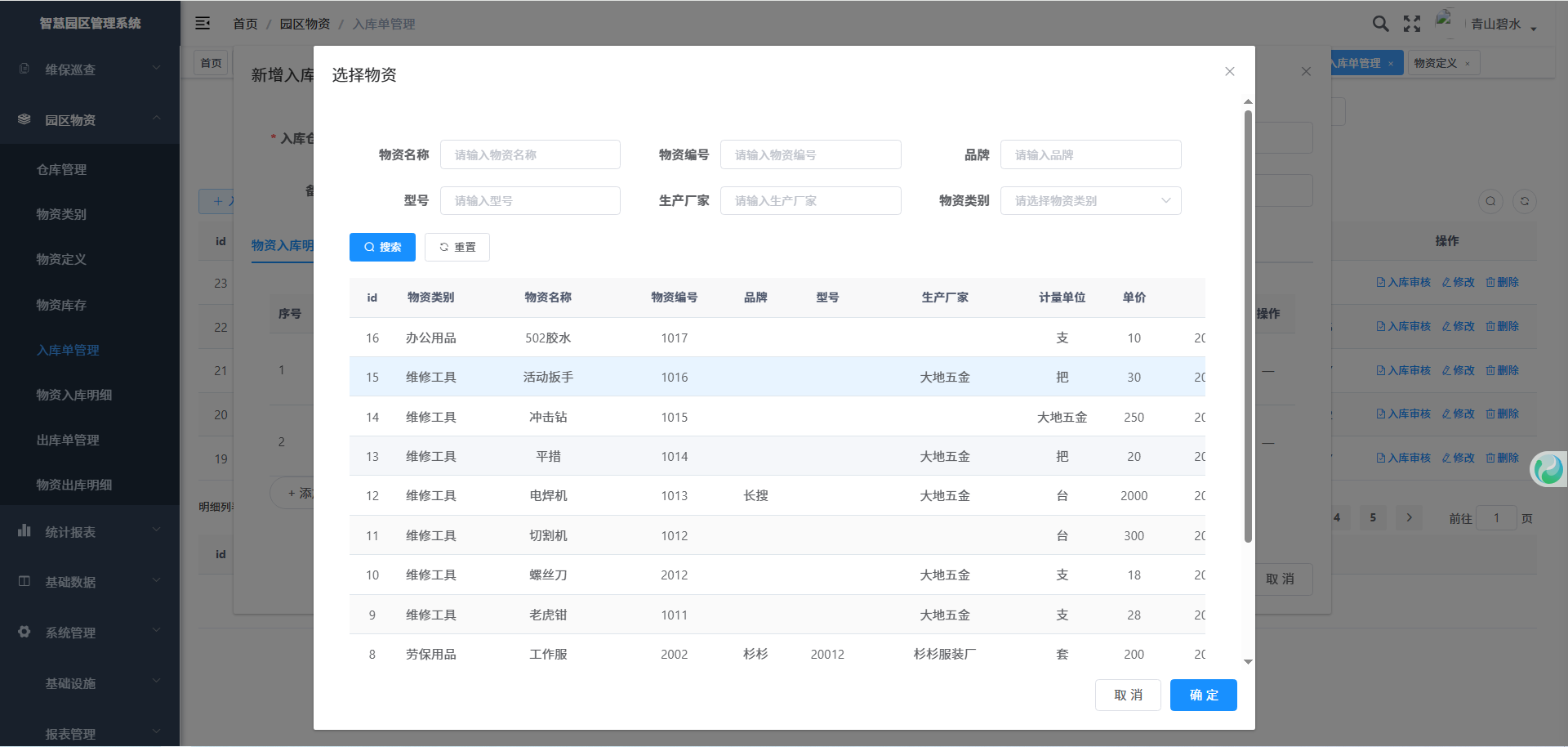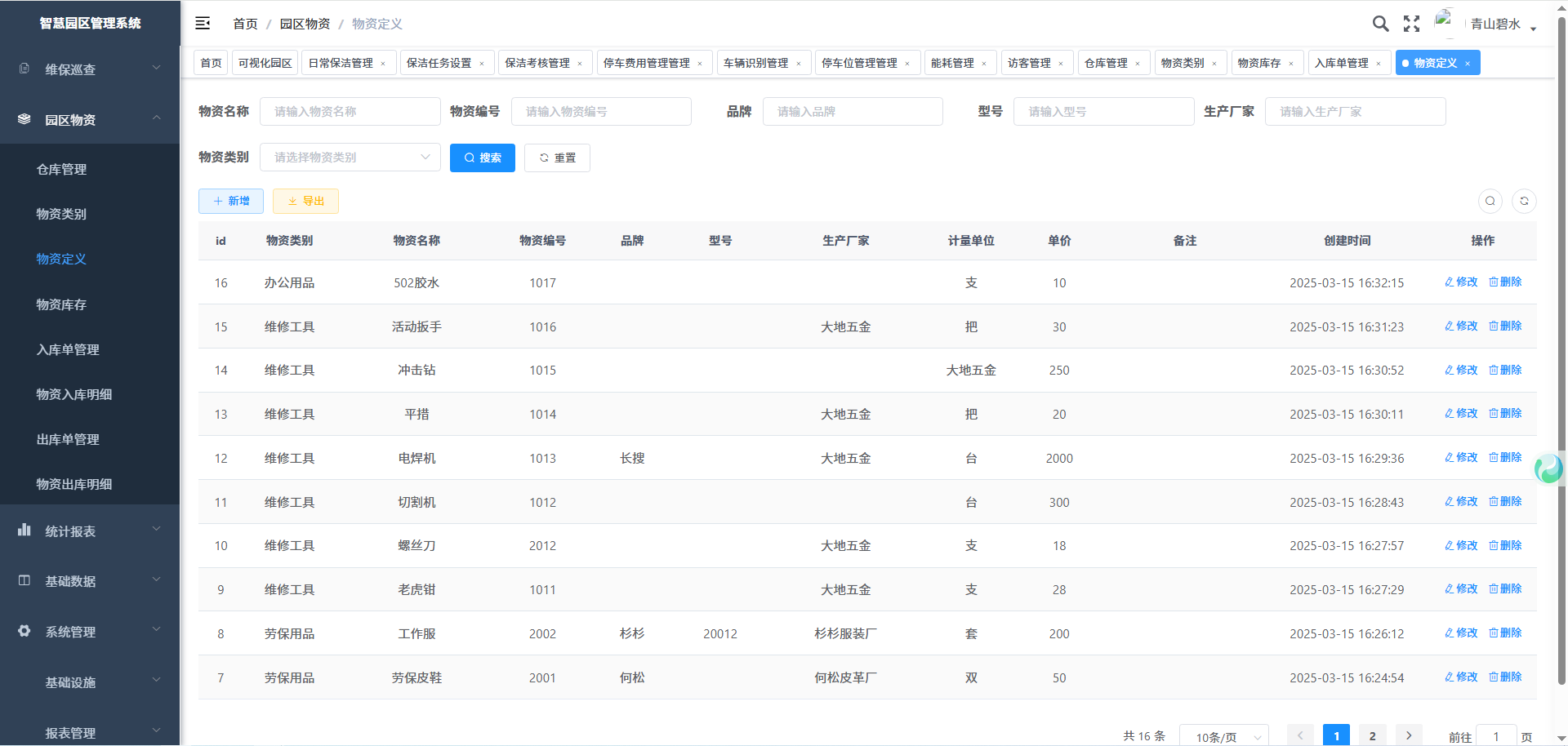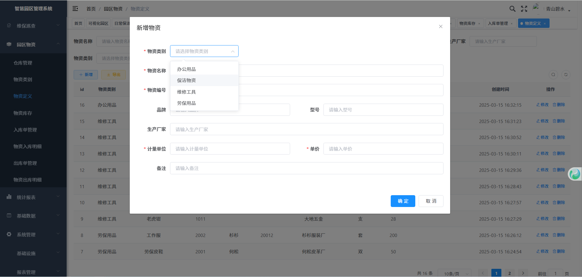 用于添加设置园区物资、材料、商品的名称、编号、类别、价格、单位、品牌、供应商等信息,是库存管理的基本操作单元。