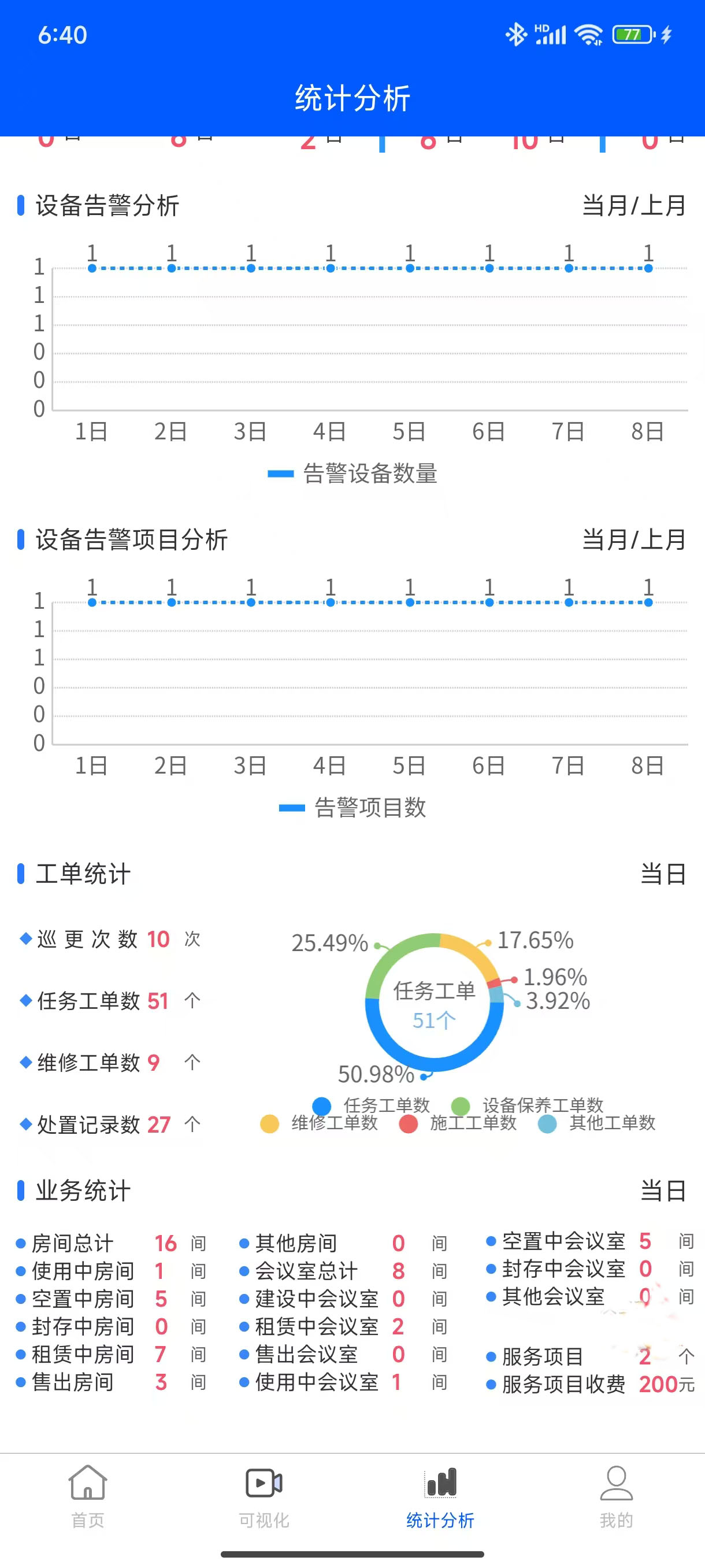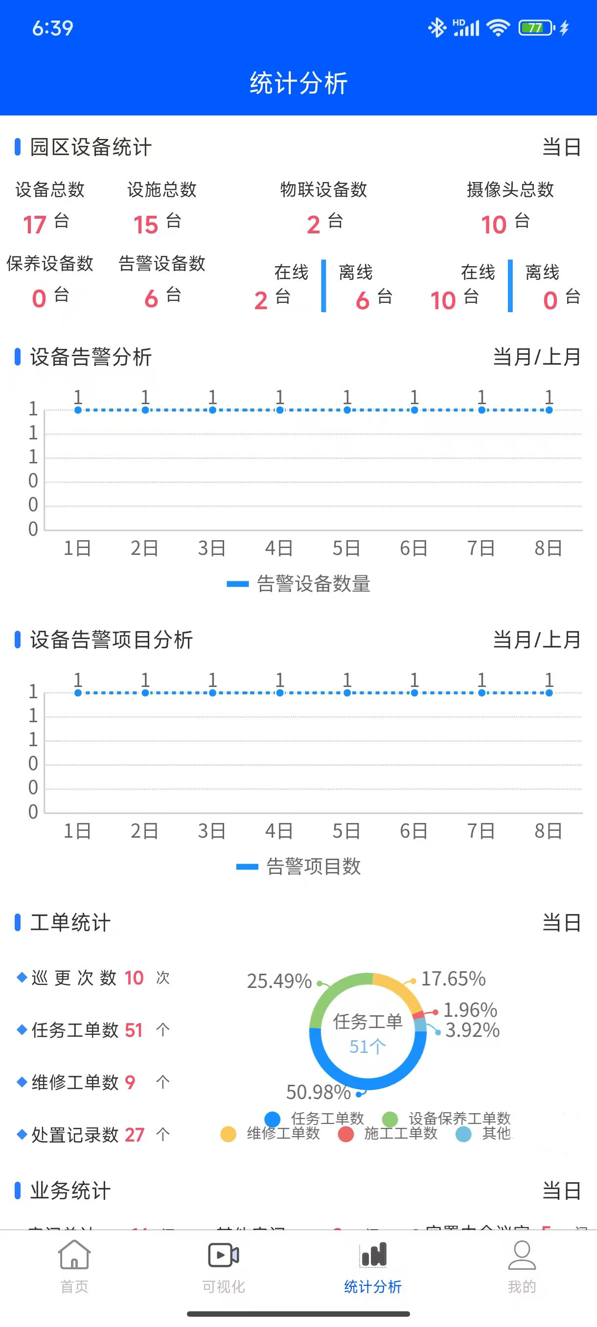 宜联智慧园区移动端APP同时提供了园区主要关键指标的监测分析功能,打开“统计分析”界面提供了园区整体情况的仪表盘功能,图形化报表汇总园区概览,供园区管理者实时掌握了解园区生产运营指标数据。
