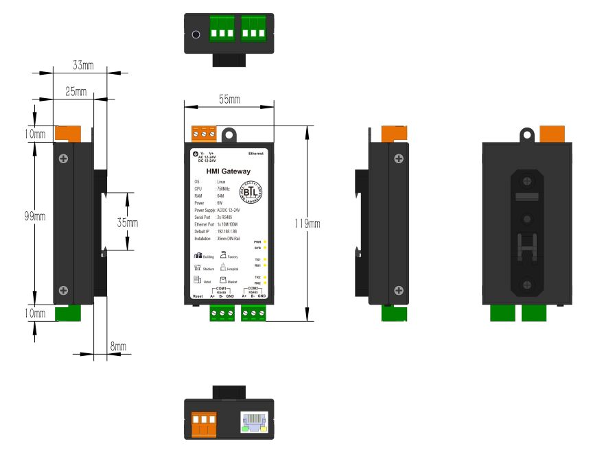 硬件参数: 处理器:1核750MHZ电源:AC/DC 12~24V内存:64M 高性能内存Flash:32M系统:LINUX系统功耗:6W重量:210g材质:镀锌板安装方式:导轨式、壁挂尺寸(L×W×H):接口:1个网口,2个RS485(电磁隔离)温度:-20~70℃(工作) -40~85℃(储运)网络:1个高性能100M/10M以太网接口,支持AUTO MDI/MDIX湿度:20%~90%无凝露(工作) 15%~95%无凝露(储运) HMI1302-Lite尺寸图 HMI1302-Lite现场应用原理图
