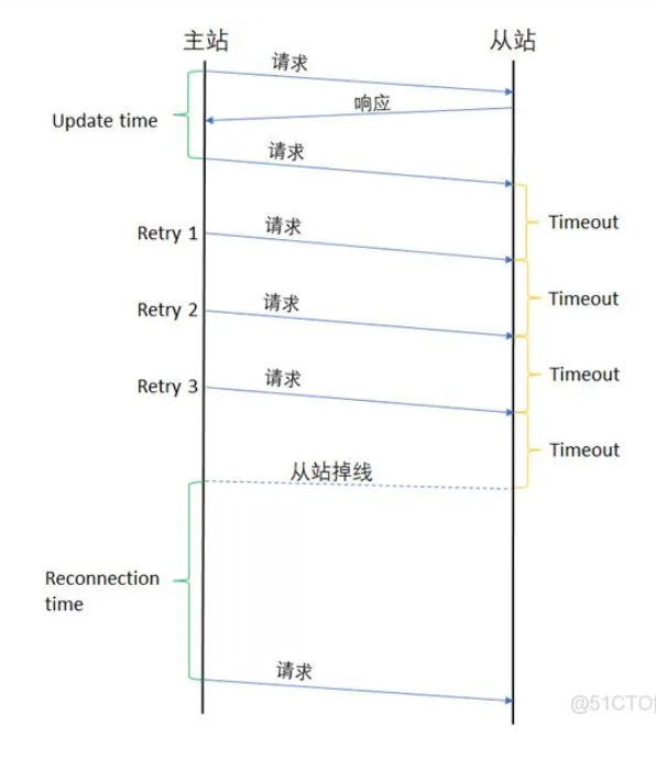 Modbus通讯采用轮询的方式,Update time是请求指令的更新时间,在Modbus主站发送请求数据后,如果在Timeout时间内没有收到从站设备响应数据,主站将接着发送请求数据,如果在连续Retry次数后都没有收到该设备的响应数据,主站认为该从站设备掉线,在ReConnection time前将不再向该设备发送请求报文,以免增加总线轮询时间。