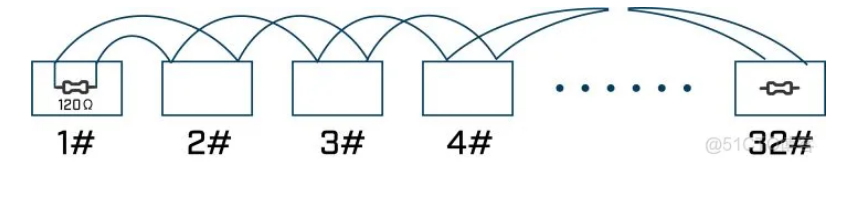 RS485总线随着传输距离的延长,会产生回波反射信号,为避免信号反射,导致信号传输不稳定,当线缆长度较长时(譬如超过100米),数据传输线必须有终点,并且分支长度尽可能的短。正确的终端需要终端电阻RT匹配,其值为传输线的特性阻抗Z0。RS-485标准建议线缆的Z0=120Ω。电缆干线通常终端匹配120Ω的电阻,线缆的首末尾处各一个。