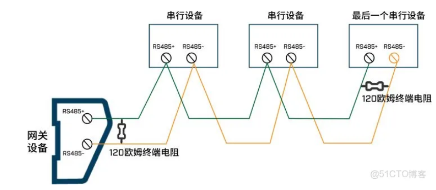 使用屏蔽双绞线,采用手拉手菊花链式拓扑结构将网关和各串行设备节点连接起来,并在网络起始端和末尾端设备的RS485+和RS485-之间各并接一个120Ω电阻以减少信号在两端的反射。