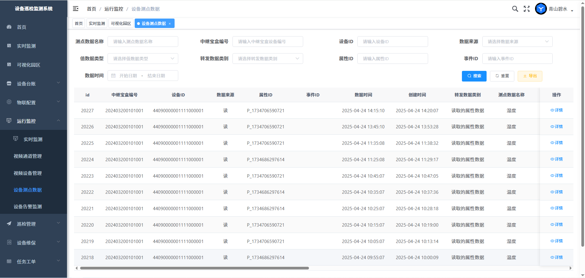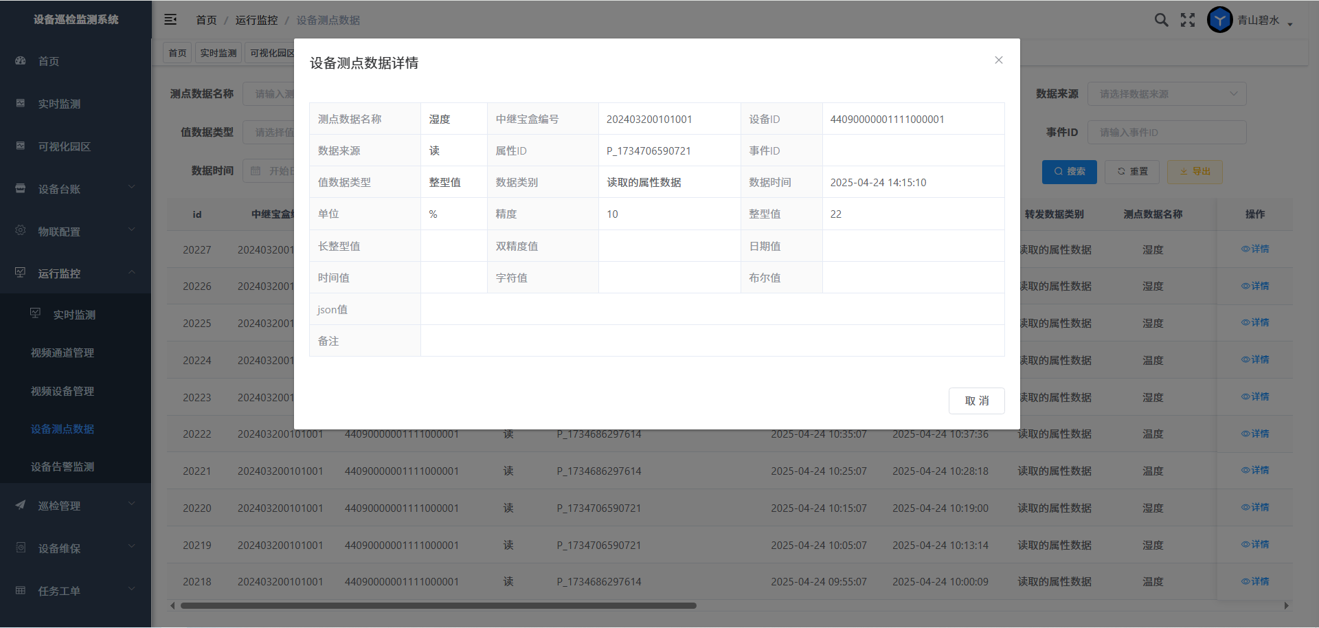 设备测点数据由系统平台根据接入的宜联IOT宝盒数据同步而来,点击详情则显示详情数据