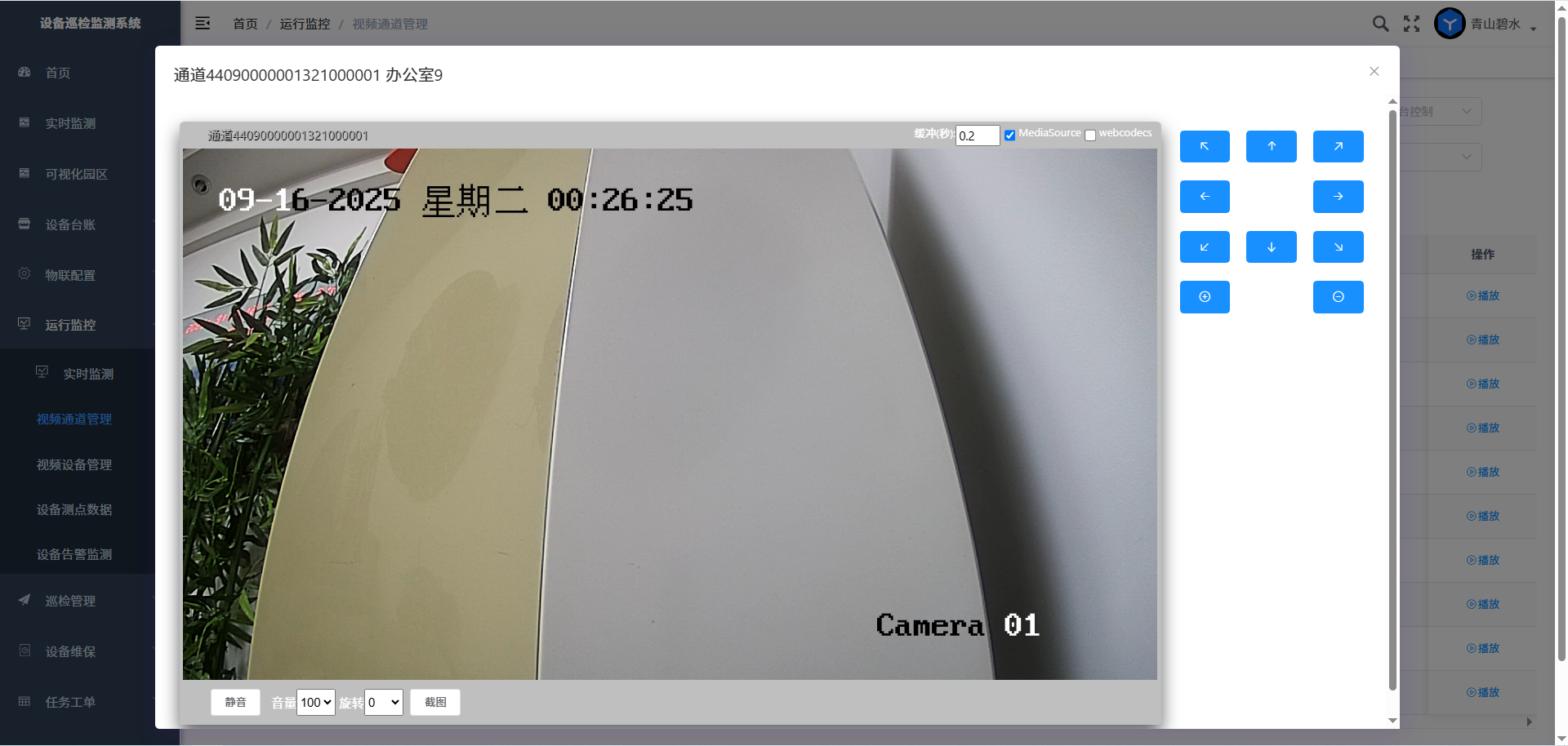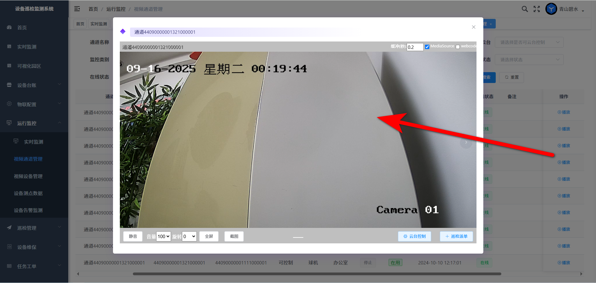 视频通道管理界面列出了园区接入的摄像头通道列表,操作栏选取通道,点击“播放”按钮,则打开播放器,实时播放所选通道视频流信息;