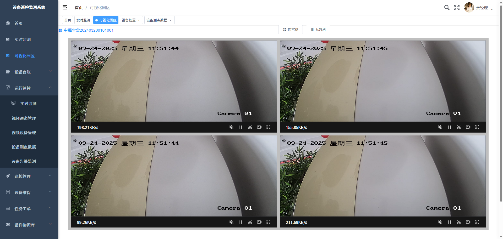 点击左侧“可视化园区”菜单,则可在系统界面分4宫格或9宫格集中播放4路或9路视频
