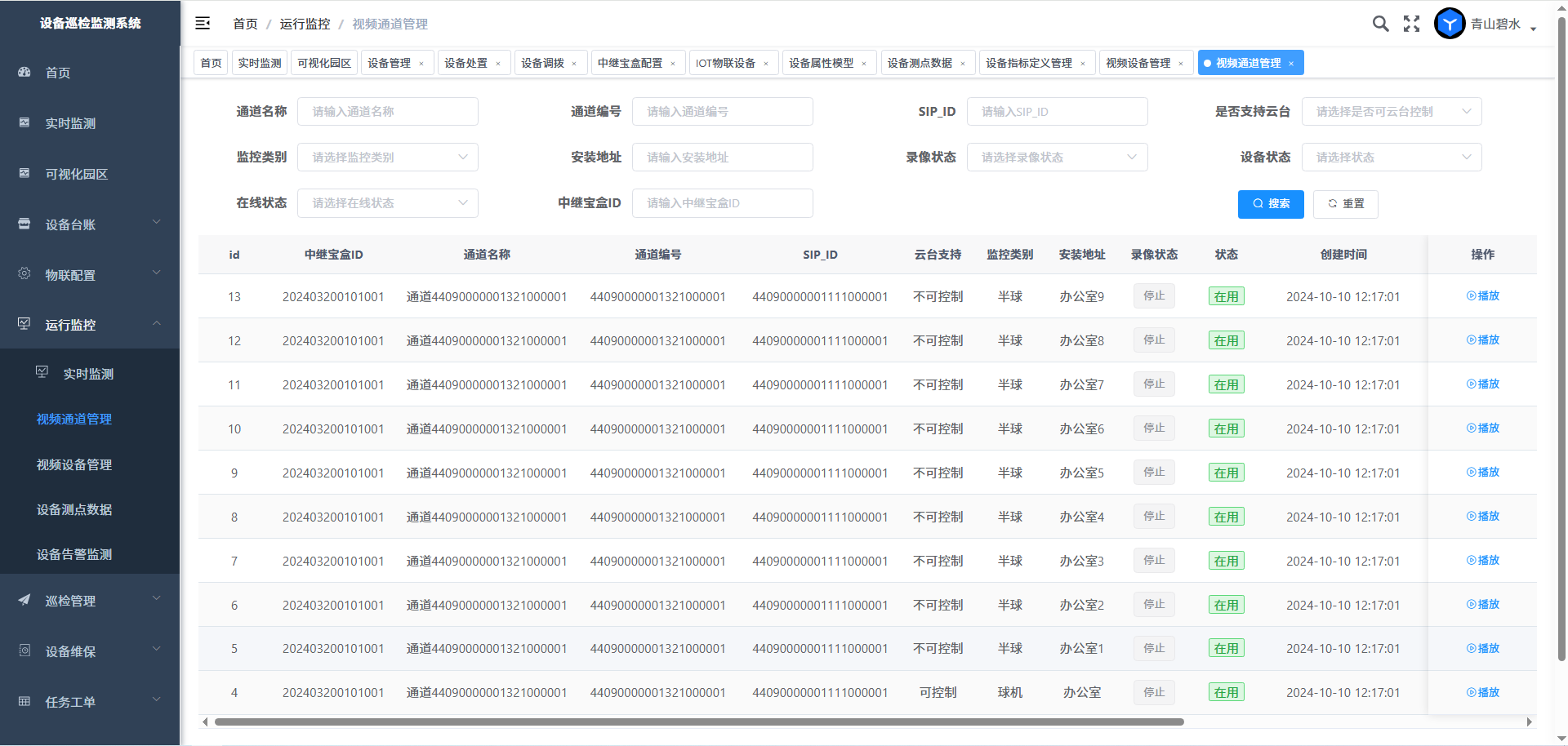 设备物联管理模块主要有实时监测、视频通道管理、视频设备管理、设备测点数据、设备告警监测管理几部分。