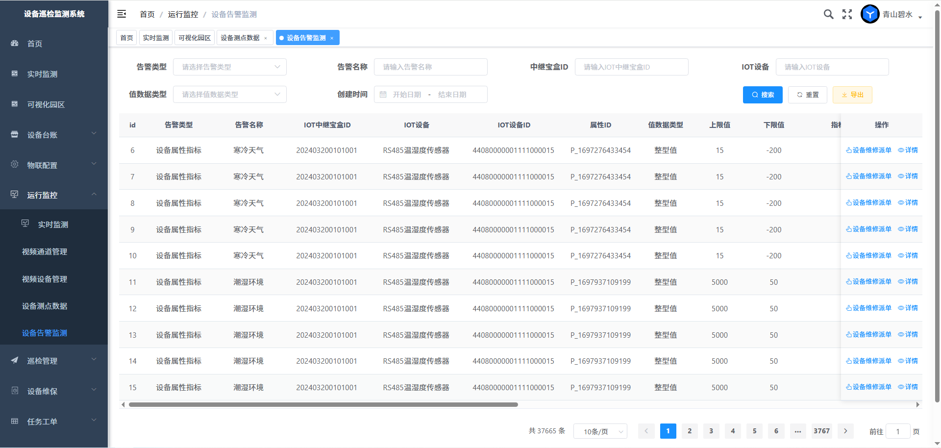 点击菜单“设备告警监测”,此界面功能列出的告警设备和项目,其数据来源正是由上一节“设备指标定义”设置物属性阈值范围由平台对比采集的设备属性数据生成。