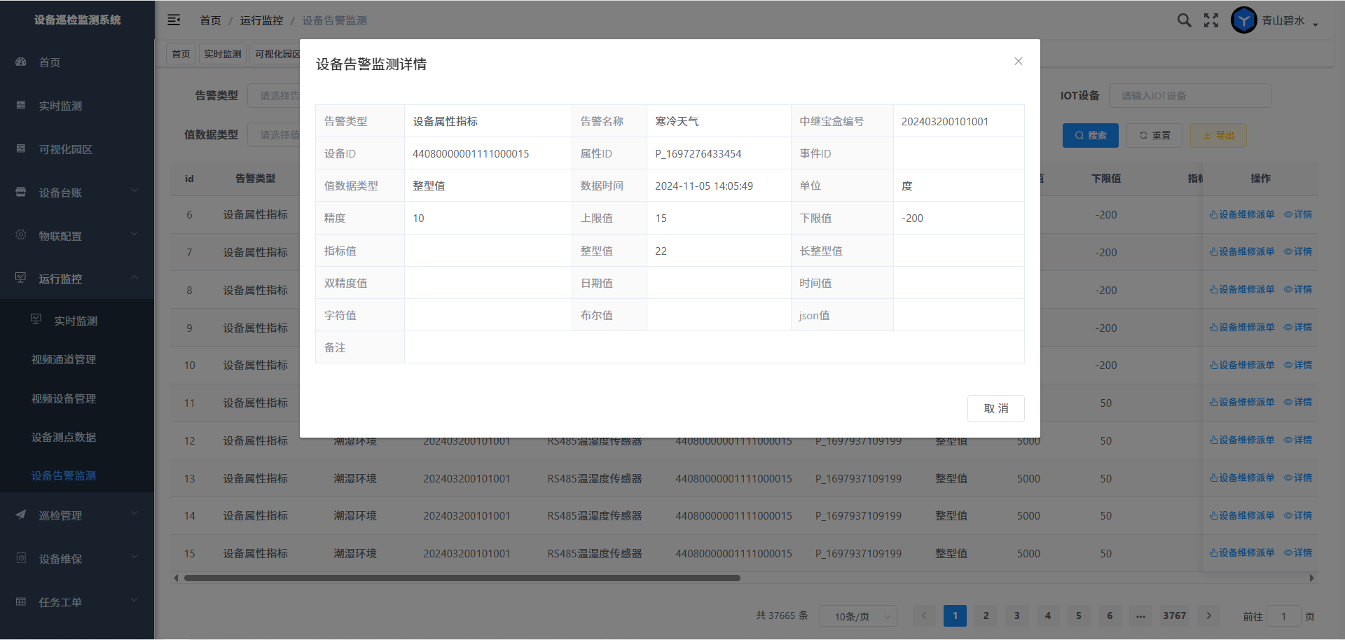 点击详情,打开设备告警数据详情页面
