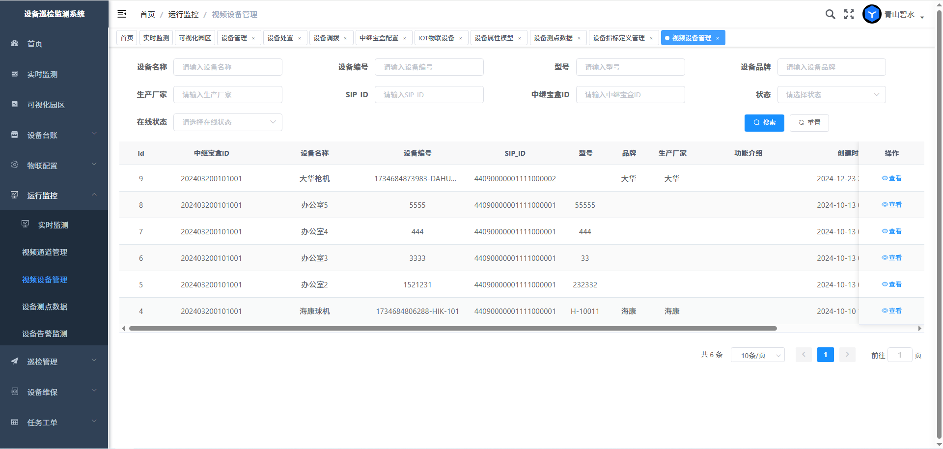 “视频设备管理”界面展示了园区接入的NVR视频设备列表,操作栏点击“查看”则可查看接入的NVR视频设备详细参数
