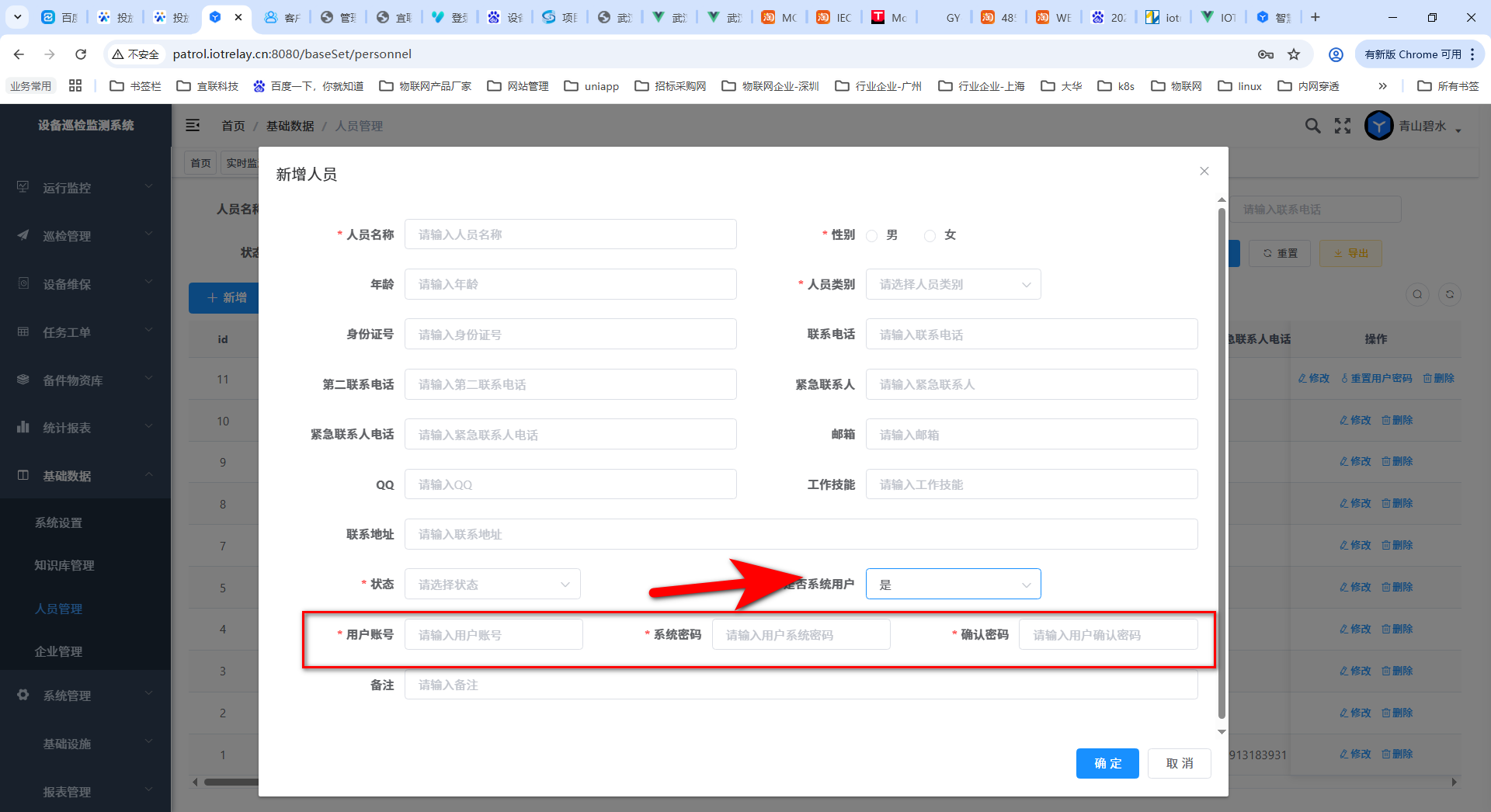 新增的人员可以设置是否有权限使用本管理系统的第三方人员,如果有使用系统权限,则要给其分配系统使用账号和密码。