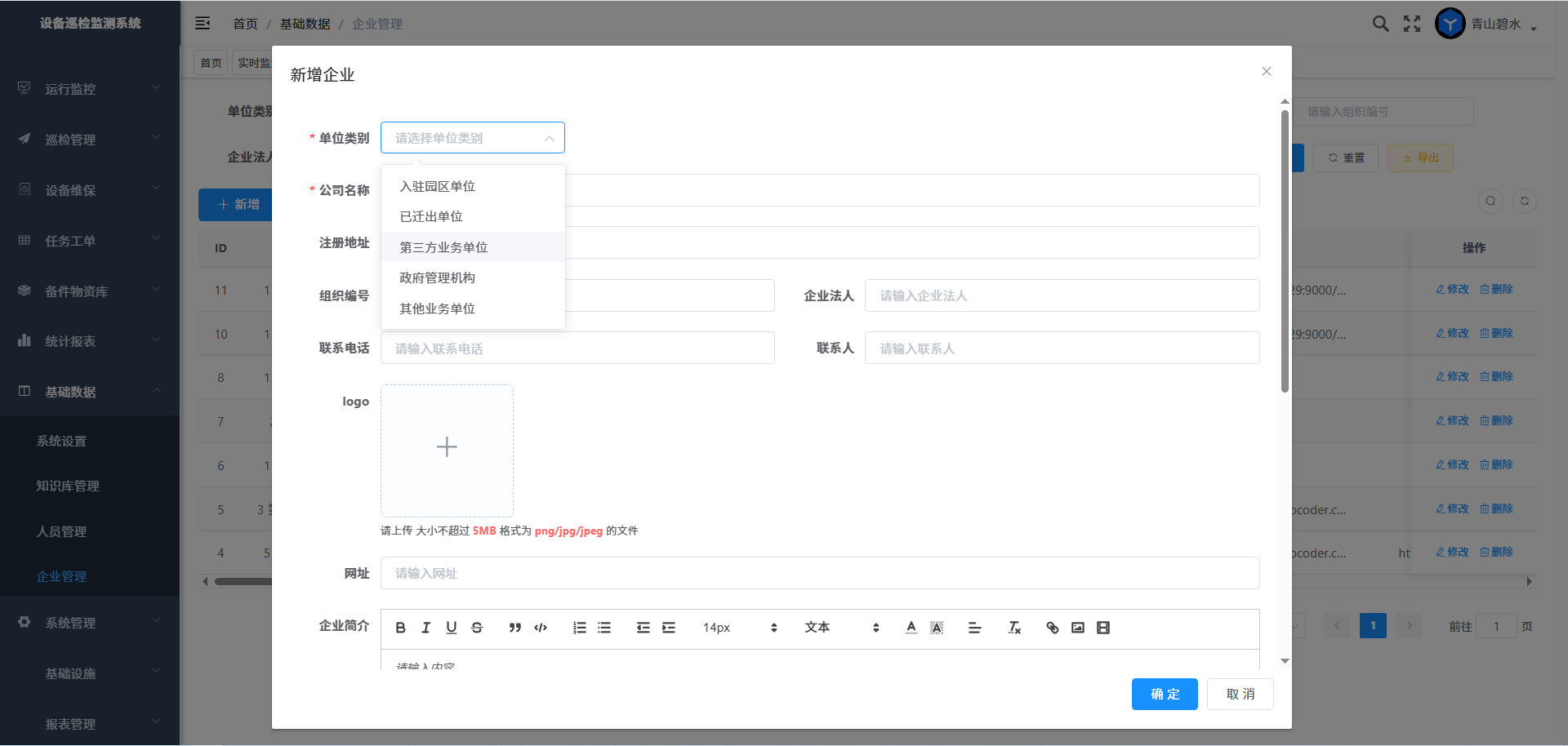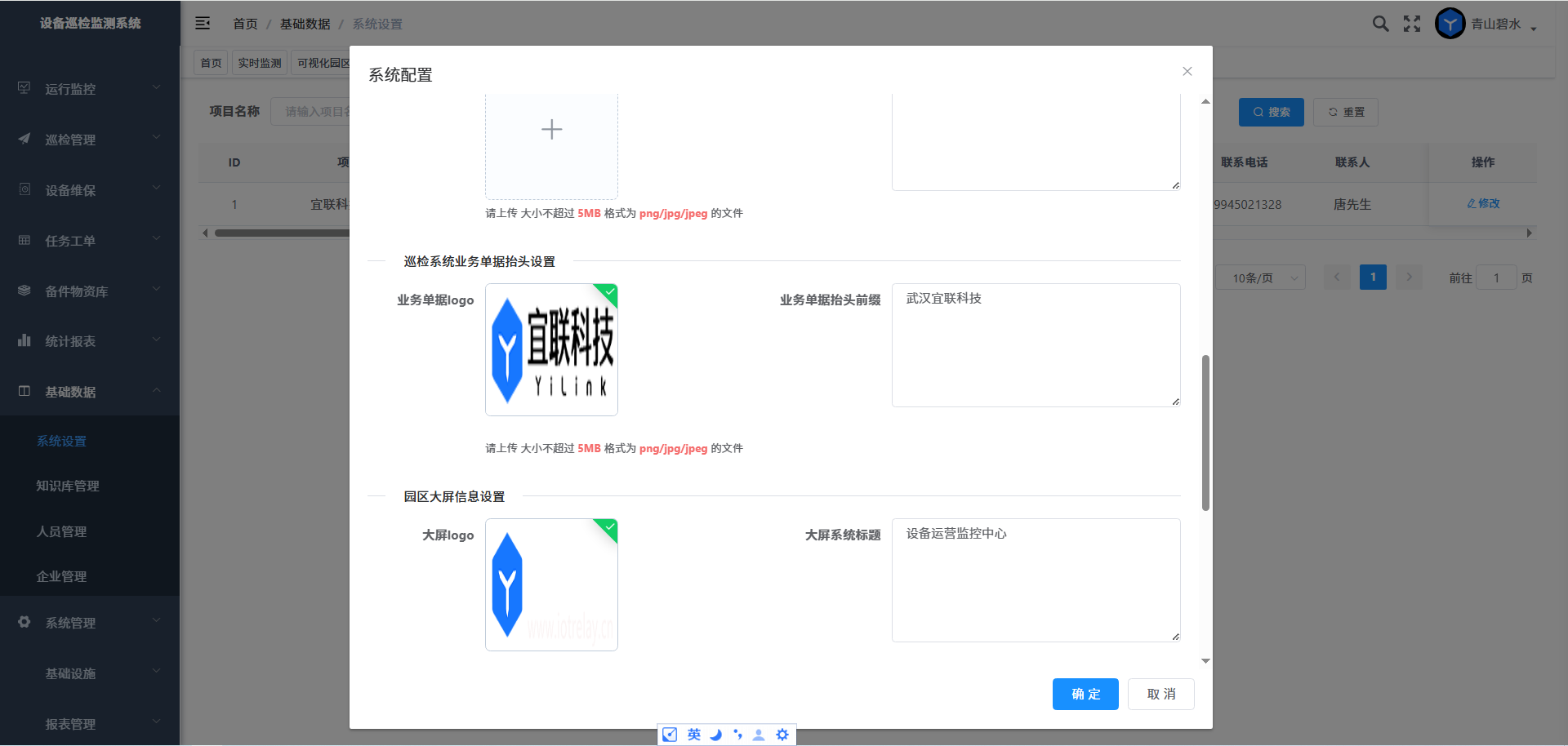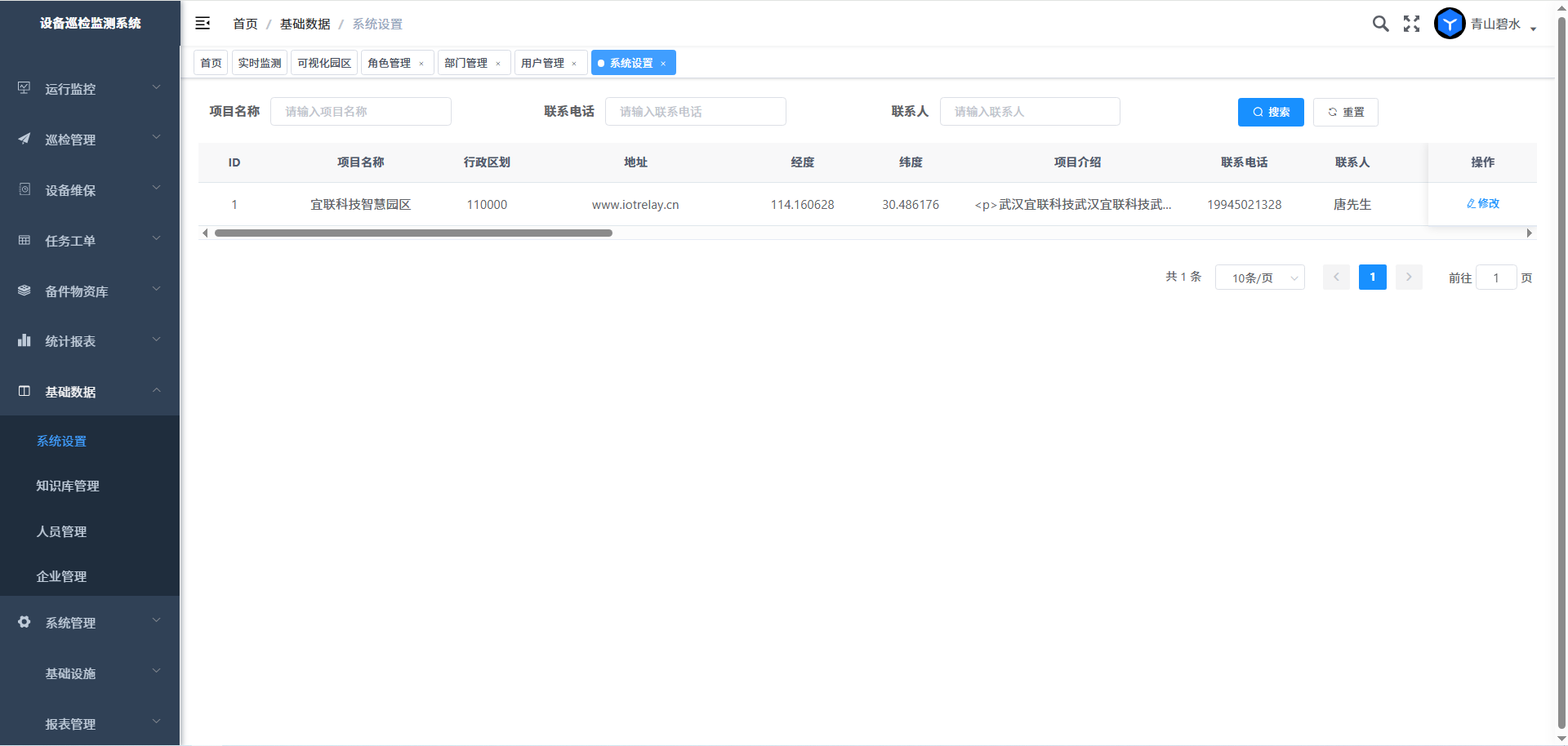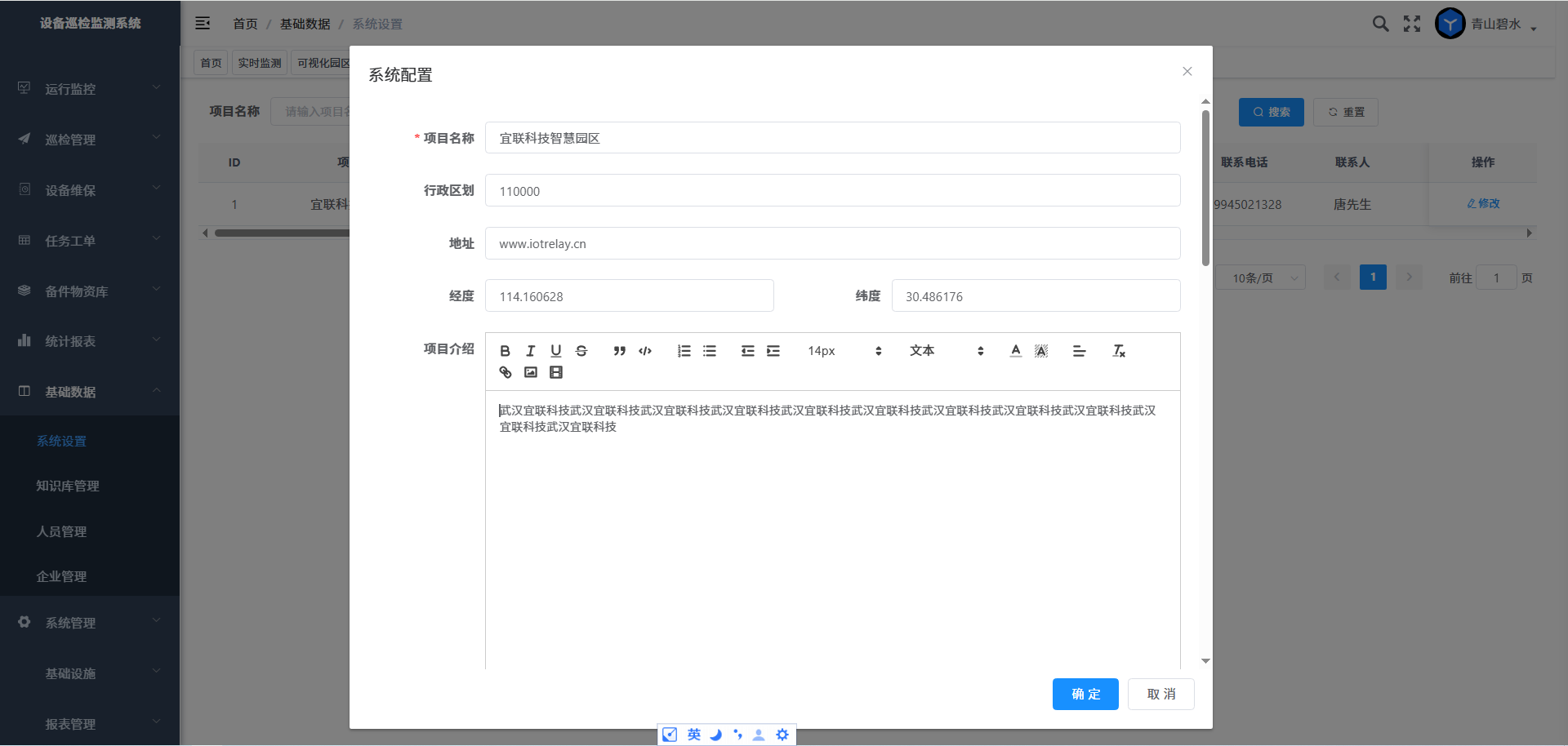 点击左边菜单“基础数据”展开,点击“系统设置”子菜单,打开园区参数设置界面,点击操作栏“修改”打开园区参数设置界面,在此界面主要用来设置园区的名称、logo、地址、坐标、园区介绍、联系方式以及园区可视化大屏需要展示的项目名称、logo、园区介绍信息等。