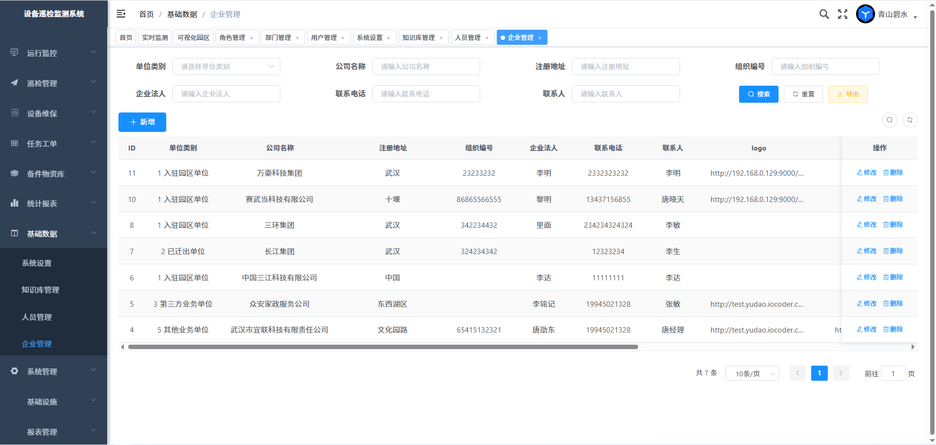 点击左边“企业管理”子菜单,打开园区企业管理界面,在此界面添加登记入驻园区的企业信息以及第三方服务机构企业信息,如图