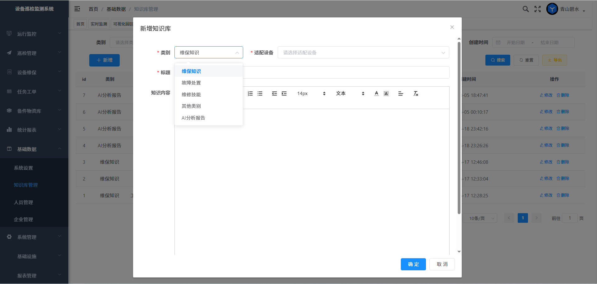 点击左边菜单“知识库管理”子菜单,打开管理界面,点击“新增”打开添加知识库知识界面。