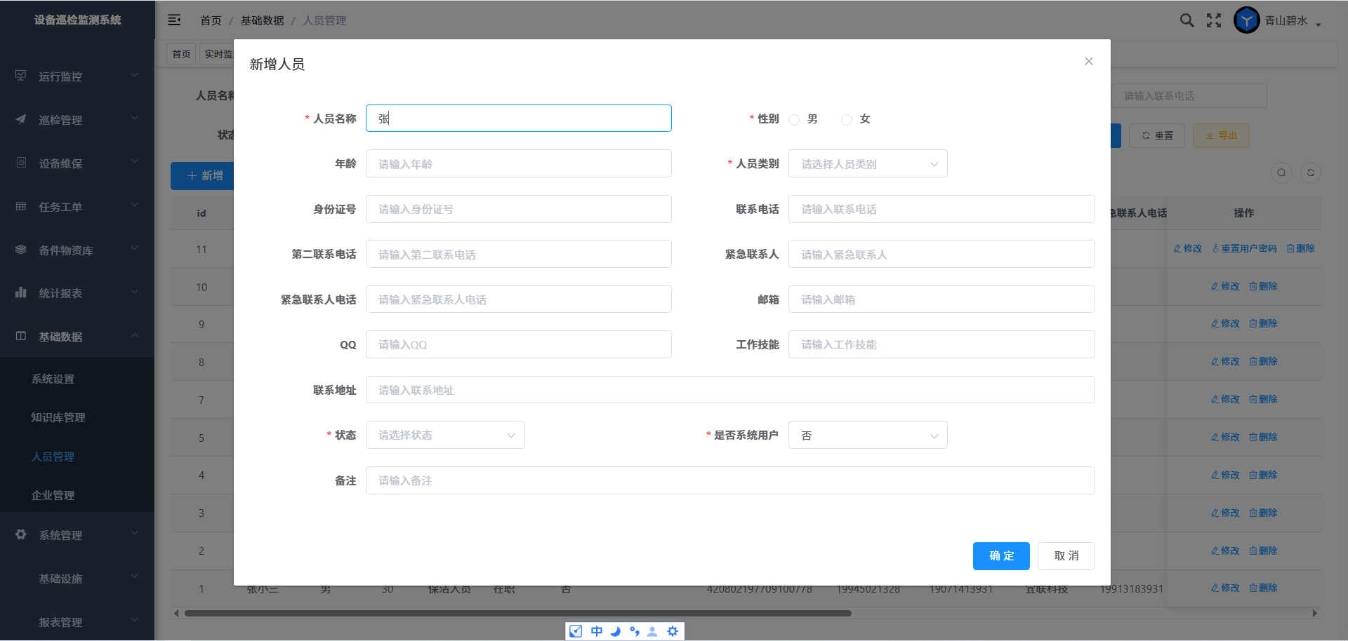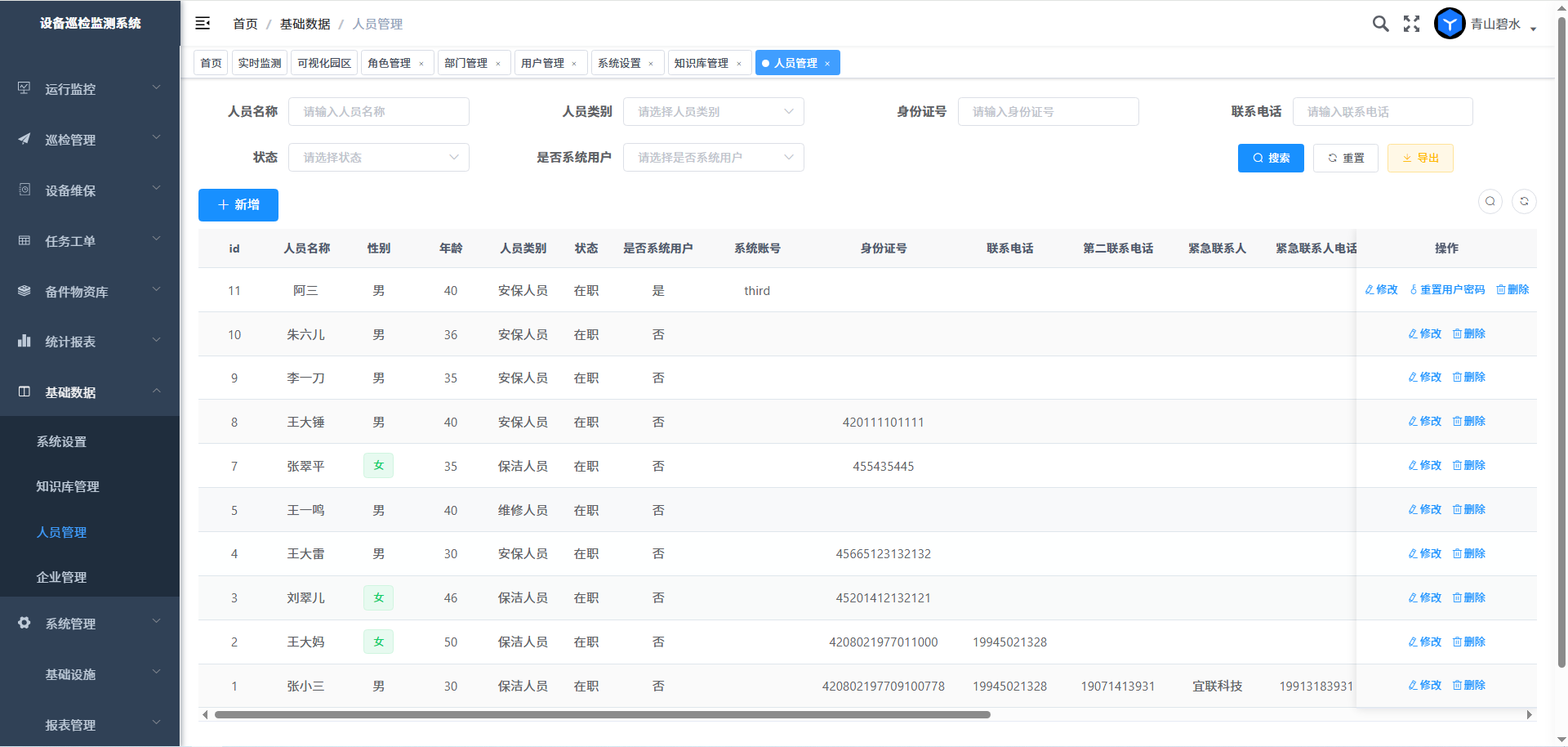 点击左边“人员管理”子菜单,在此操作界面添加管理园区的维修人员、施工人员、第三方服务人员等人员信息。如图: