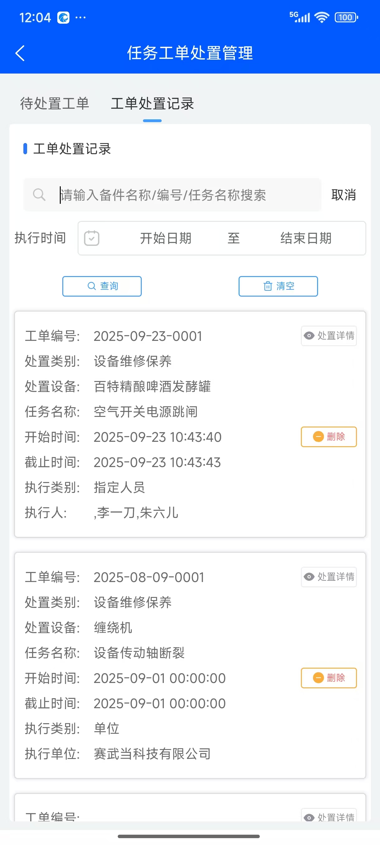 打开“工单处置记录”tab页,每此任务执行记录在此页面显示,业务上一个任务计划可能有多个任务执行记录,在工单处置记录界面点击“删除”按钮可以删除选中的工单处置记录,点击处置详情图标可以打开查看本次任务工单执行情况。