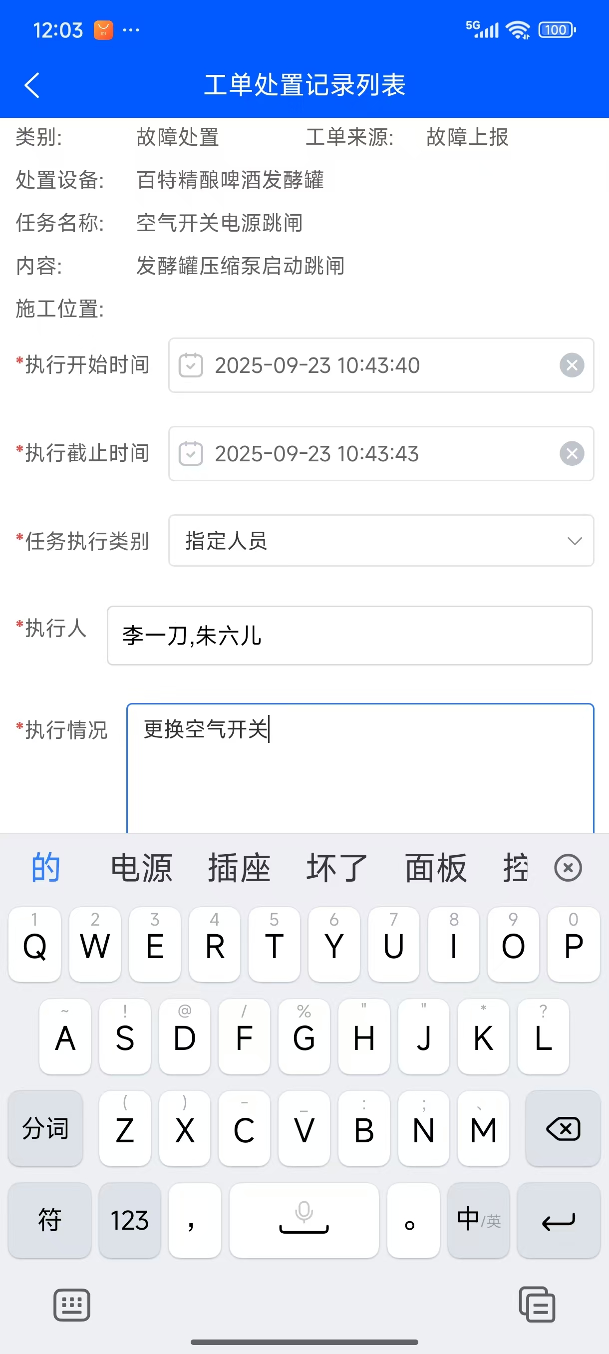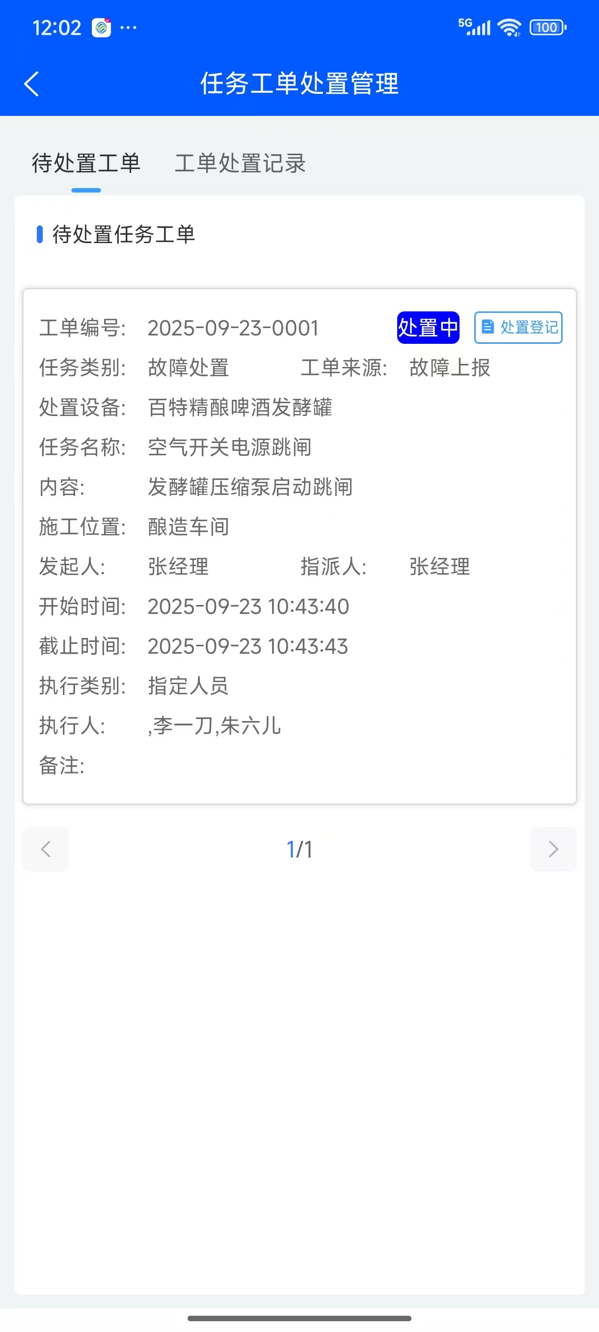 在“待处置工单”tab页选择待处置工单点击“处置登记”打开界面记录本次现场任务处置信息。在任务工单处置界面填写任务实际执行开始和截止时间、任务执行类别、任务执行人员、任务执行描述,可同时拍照上传附件,如果有备件更换,选择更换的备件