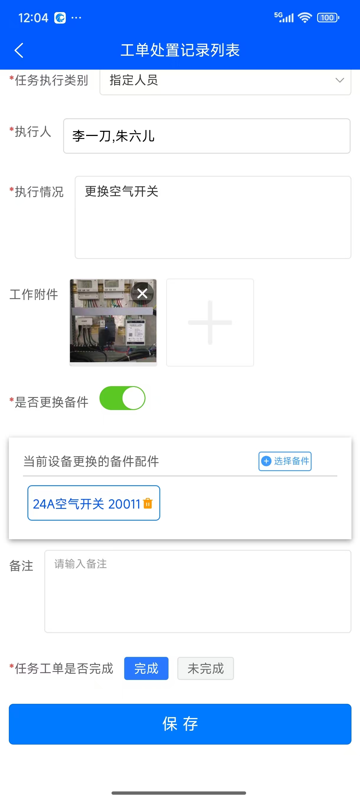 在此操作界面,底部有“任务工单是否完成”选择项,如果选择完成,则此工单执行完毕,系统进入下一个流程,如果选择未完成,则本工单后续可以添加新的任务工单执行记录。