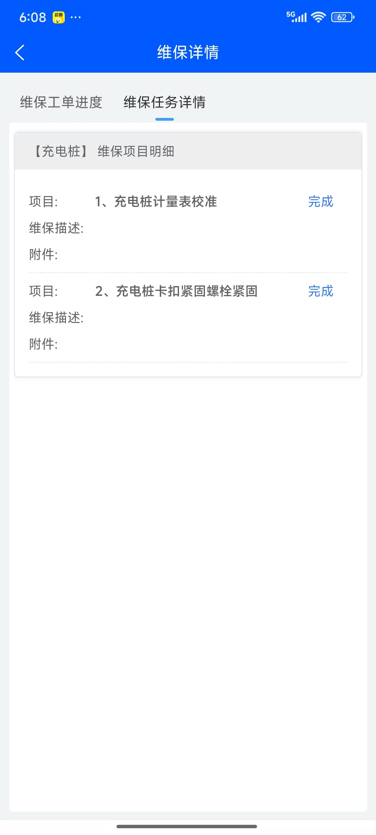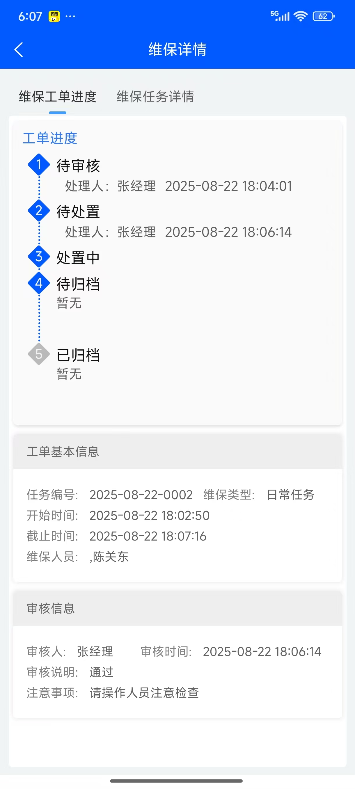 审核通过的维保任务工单在“执行中维保任务”tab标签页显示,在此界面,点击维保任务工单则打开维保任务工单详情界面,维保详情又分“维保工单进度”,“维保任务详情”两个tab页展示维保任务工单情况。