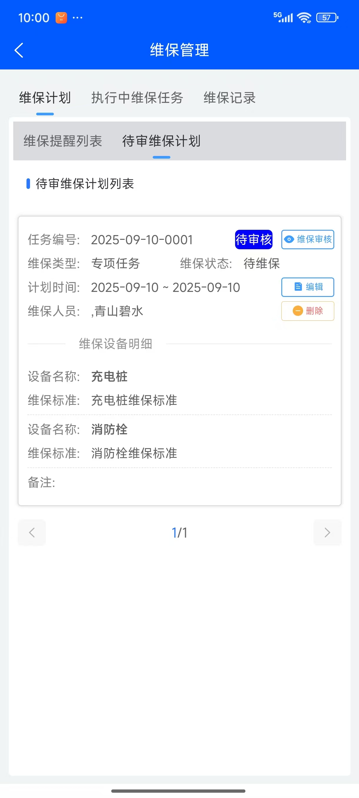 维保计划保存成功,显示在“待审维保计划”tab标签页面,待审维保计划列表显示所生成的设备维保计划单,单据状态为待审核状态,在此界面可以对维保计划点击“编辑”按钮进行编辑操作和点击“删除”按钮删除设备维保计划。点击“维保审核”按钮,则打开设备维保计划审核界面,