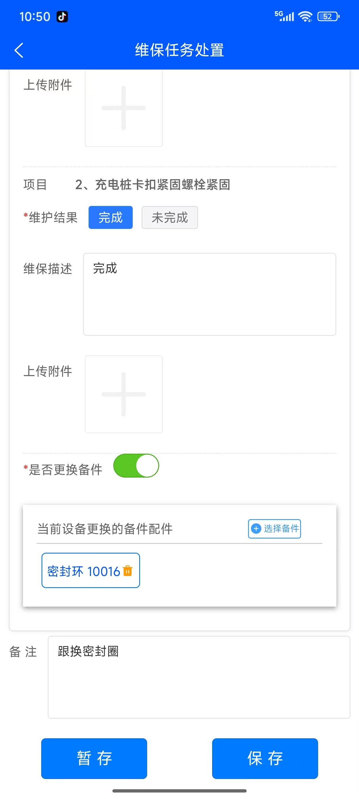 设备本次维保结果判定,选择维保任务维护结果是否完成, 如果本次维保有备件更换,则选择“更换设备备件”。