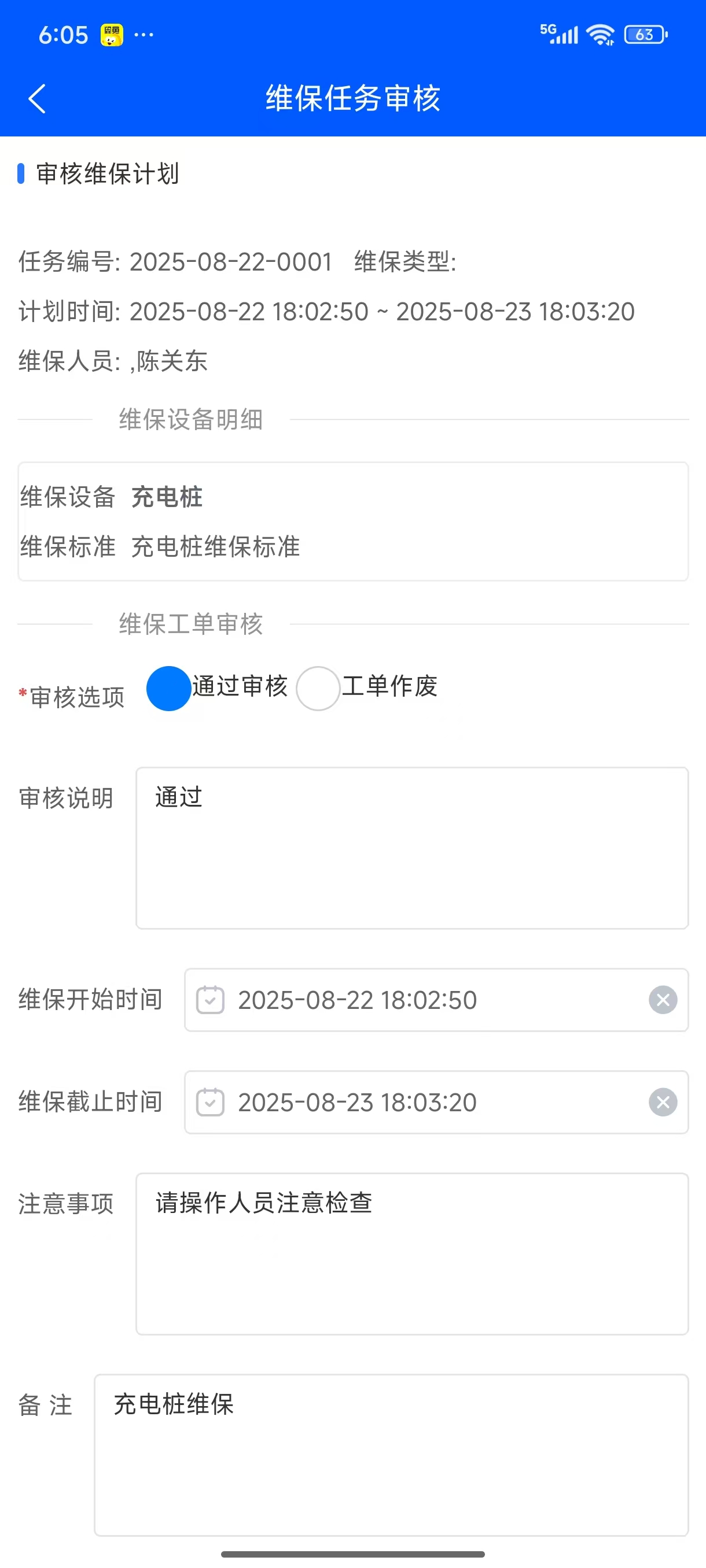 在维保任务工单审批界面,审核项可以选择维保任务工单审核通过和任务工单作废,在审批维保计划时可以变更维保任务执行时间和填写维保注意事项。