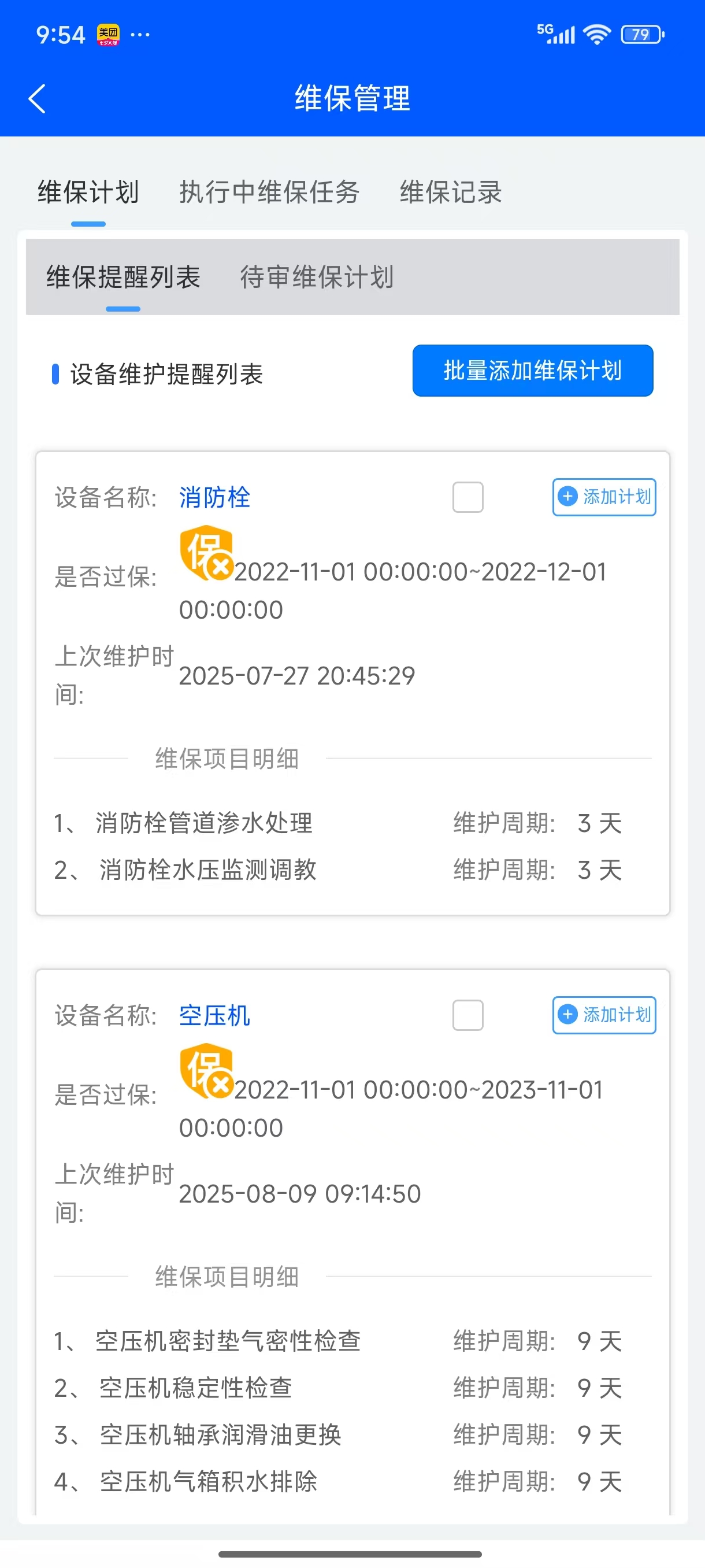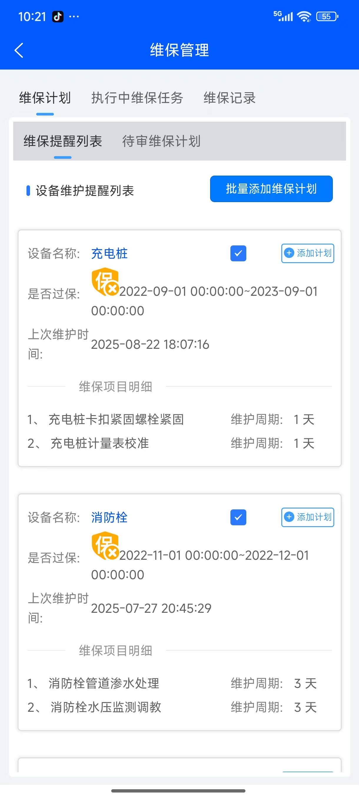 在“维保提醒列表”页面,系统根据设备维保项目、维保周期以及设备历史维保记录,自动计算列出了当日维保时间到期需要维护保养的设备,在设备维护保养提醒列表可以选择单个设备发起维保计划任务,也可以选择多个设备,批量制定设备维保计划。