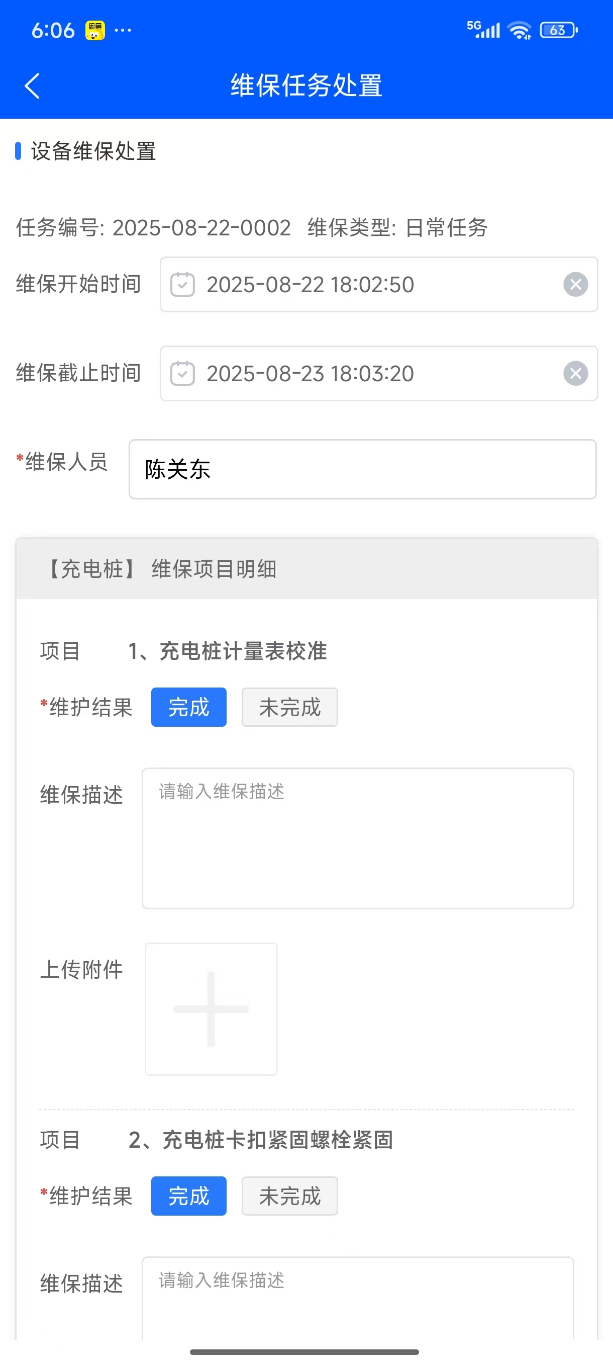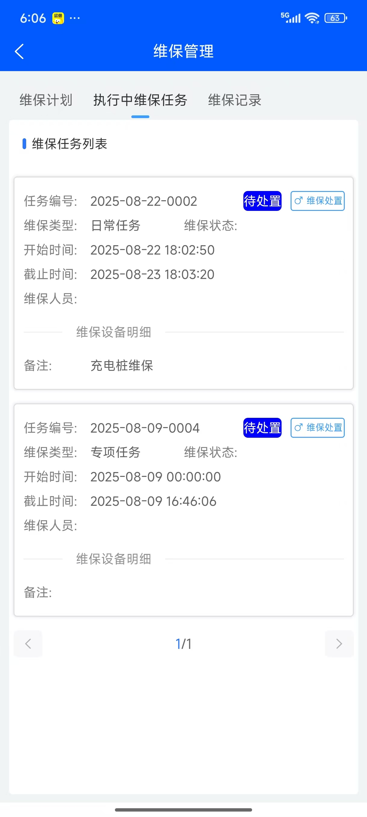 在“执行中维保任务”标签页,选择维保任务工单,点击“维保处置”按钮打开维保处置界面,在设备维保处置操作界面,选择维保任务实际执行时间、本次实际维保人员,在设备维保明细项,判定设备维保标准所列每个维保项目是否完成,填写每项现场维保情况,上传维保处置照片