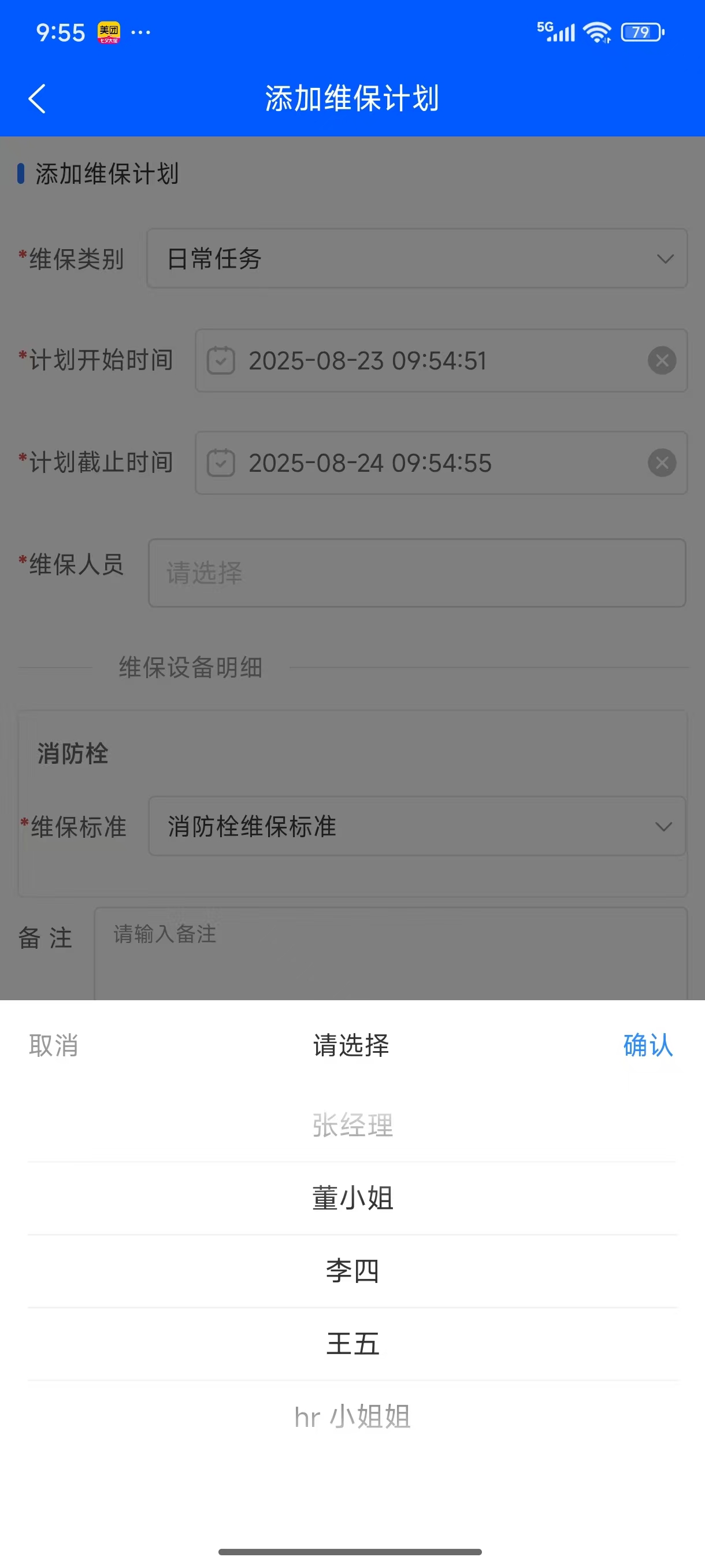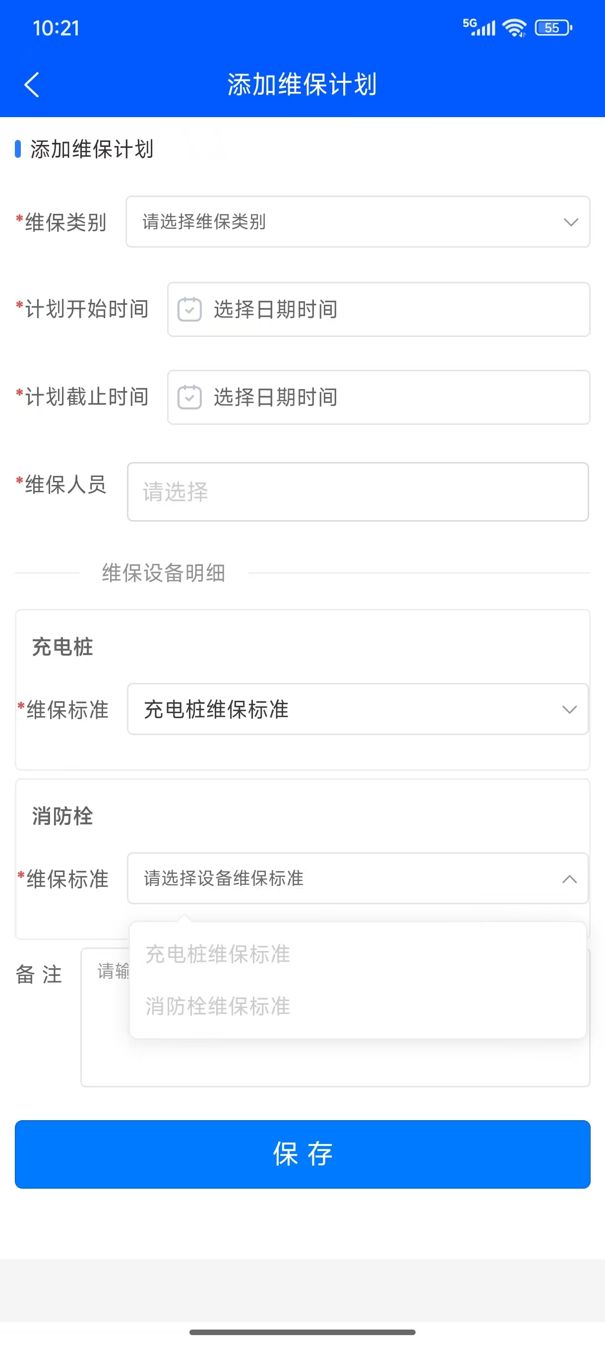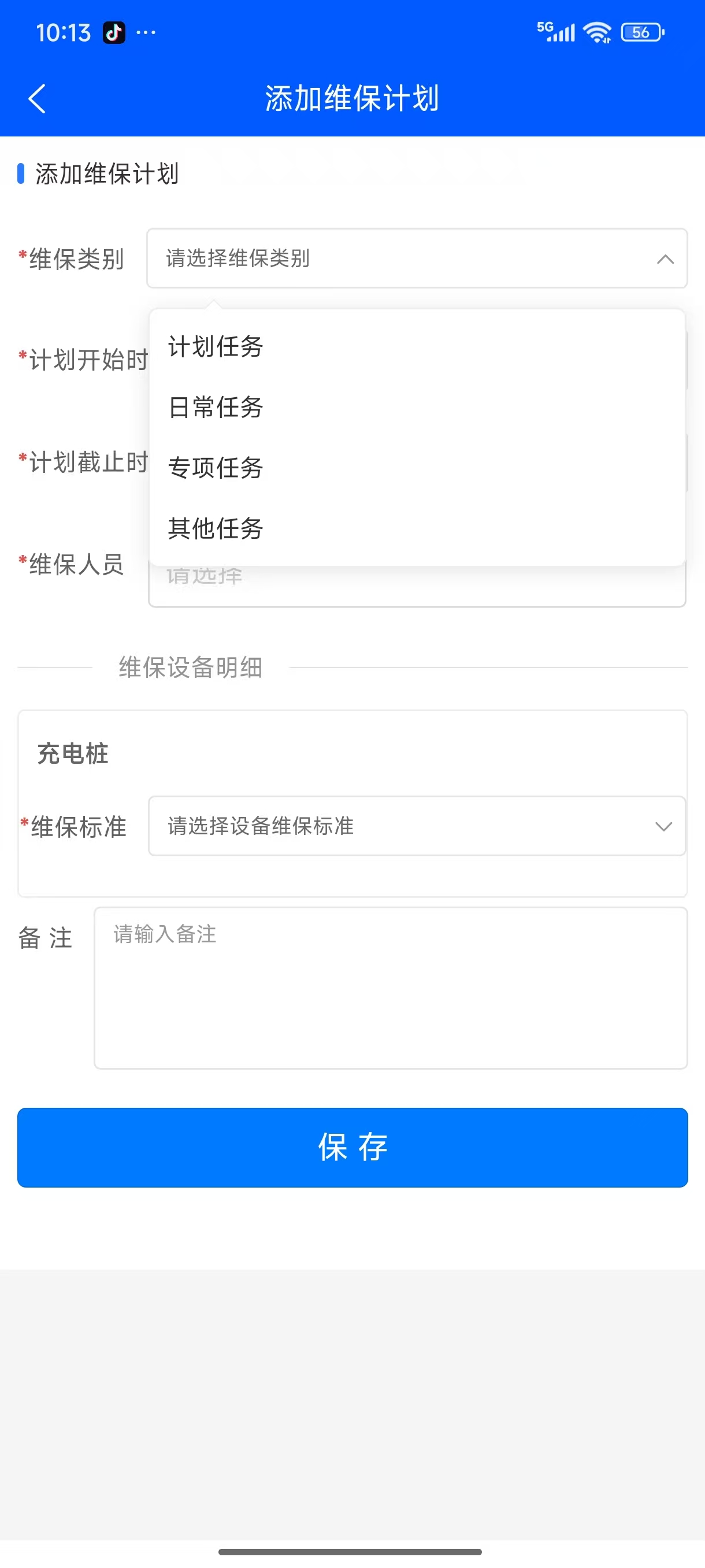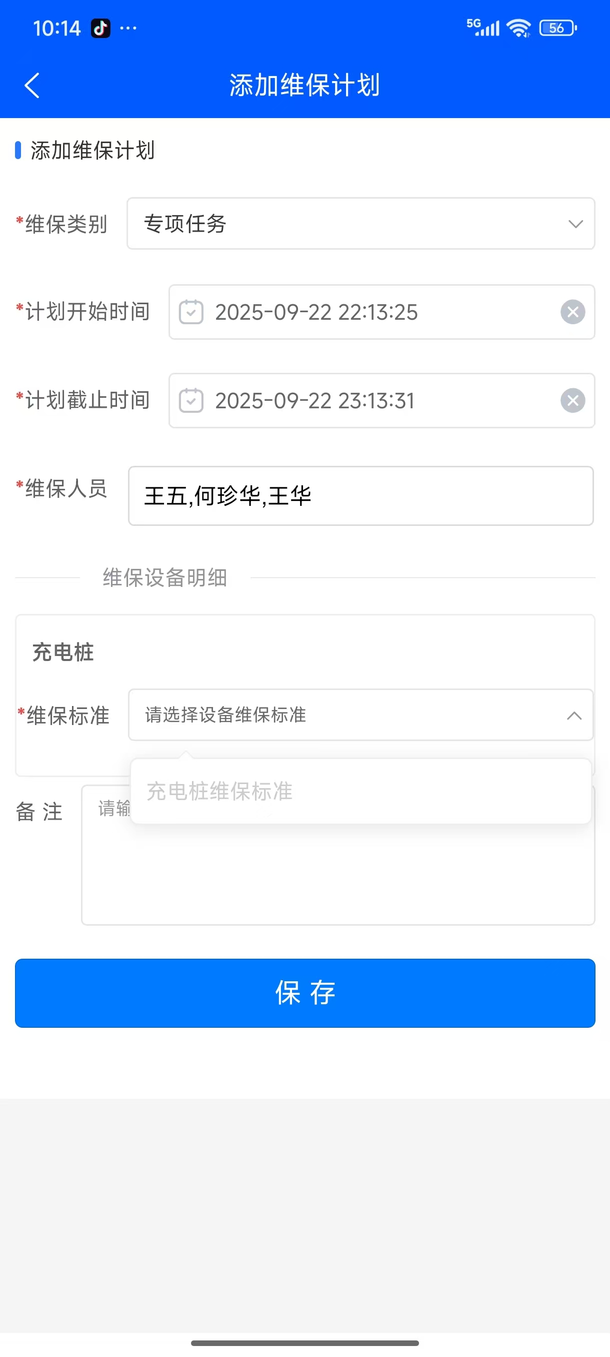 在对应设备卡牌,点击“添加计划”按钮,打开所选设备添加维保计划页面,选择维保类别,维保计划执行开始截止时间、选择维保任务执行人员,选择设备的维保执行标准,点击保存即可添加单个设备的维保计划。