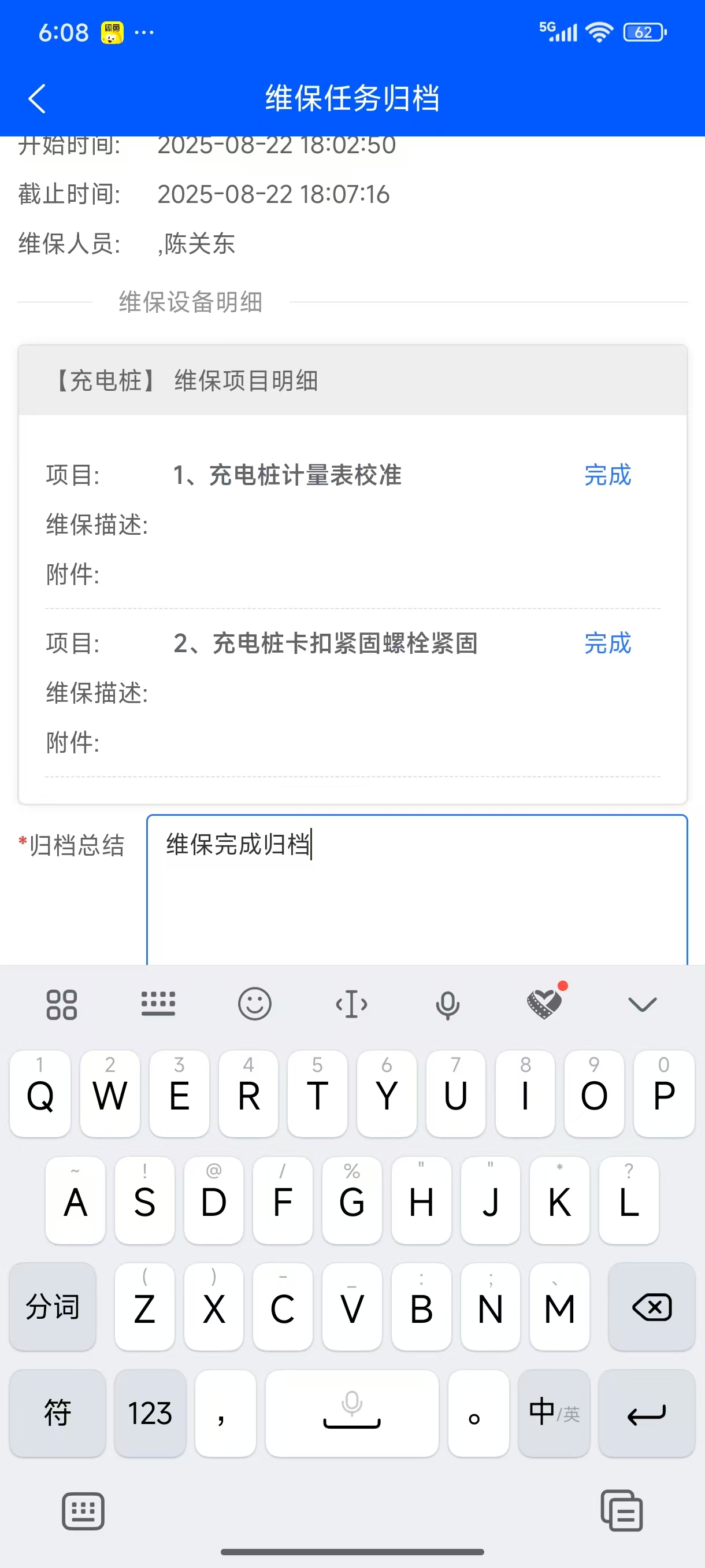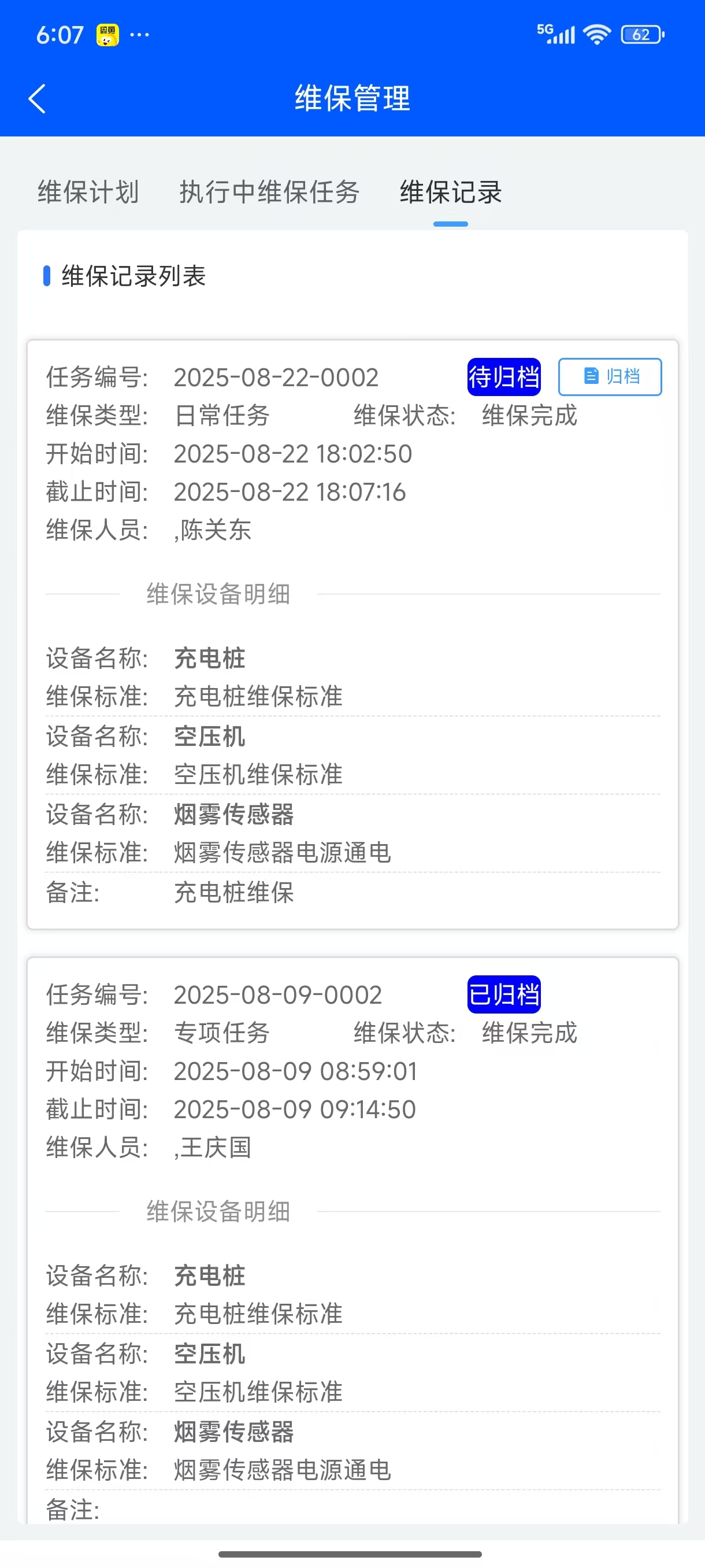 本次处置完的维保任务记录在“维保记录”tab标签页显示,维保处置完成的维保工单状态显示是“待归档”,对于待归档的维保任务工单,点击“归档”按钮打开巡检归档界面,填写归档小结,完成维保任务工单归档。