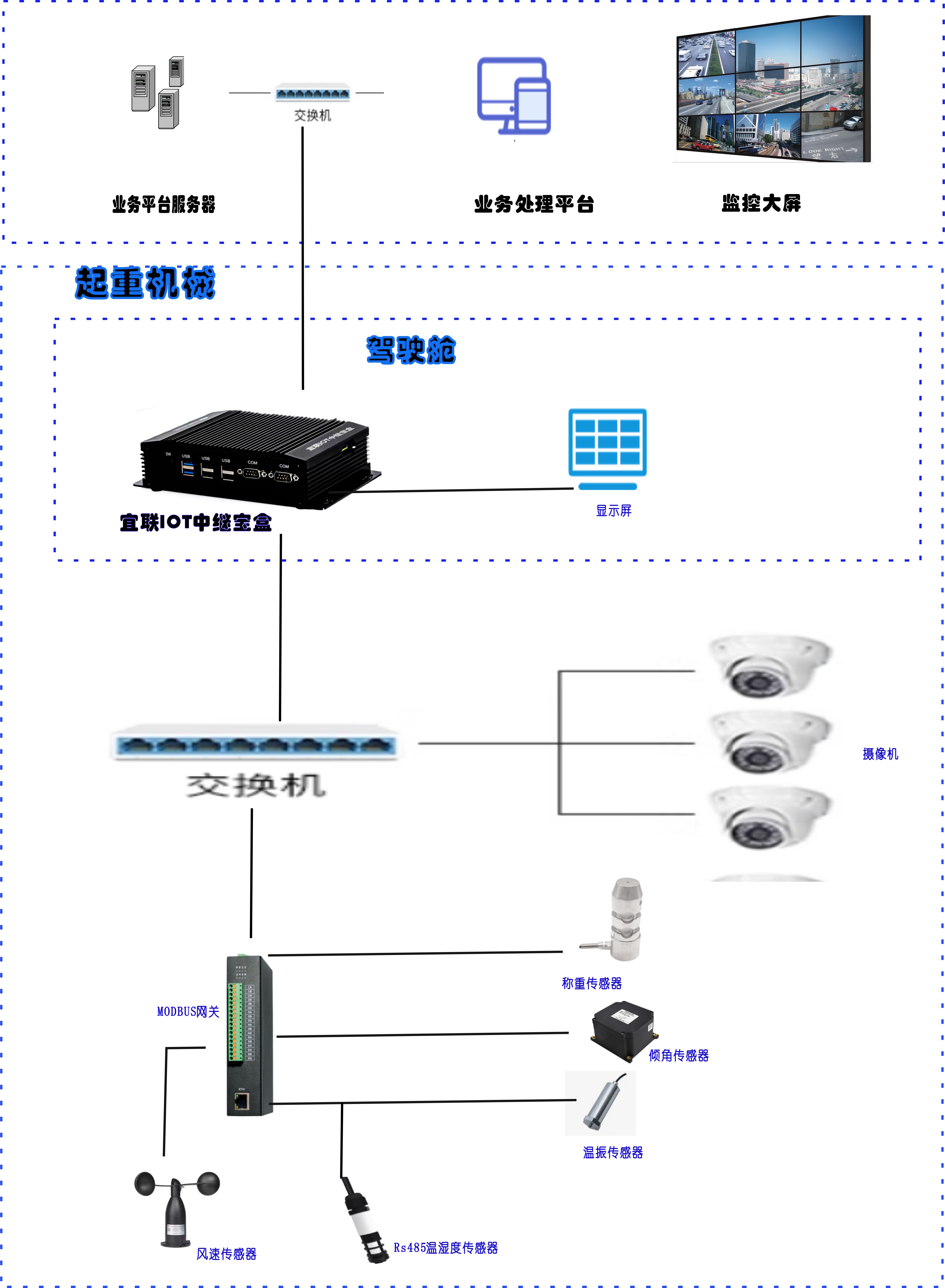 本方案采用“智能传感+边缘计算+云平台”三层架构,以宜联IOT中继宝盒为核心枢纽,构建起重设备安全监测物联网系统: