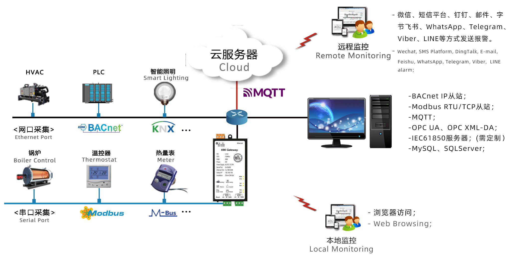 功能描述 WEB组态网关HMI1302-Lite配合组态编辑软件X2View可实现现场数据采集,并直接转为组态画面进行数据实时监控。用户无需购买组态软件,只需用电脑、手机、IPAD或自带浏览器功能的设备即可登录组态画面进行监控,实现远程监控设备启停、运行等操作,给用户带来良好的操作体验。同时具微信报警、短信平台报警、钉钉报警、邮件报警、MQTT服务、工程上传云端等功能;还可以转发为BACnet服务器、Modbus服务器、OPC UA服务器、MQTT服务器、IEC61850服务器(需定制),开放HTTP WEB服务被第三方的系统集成。