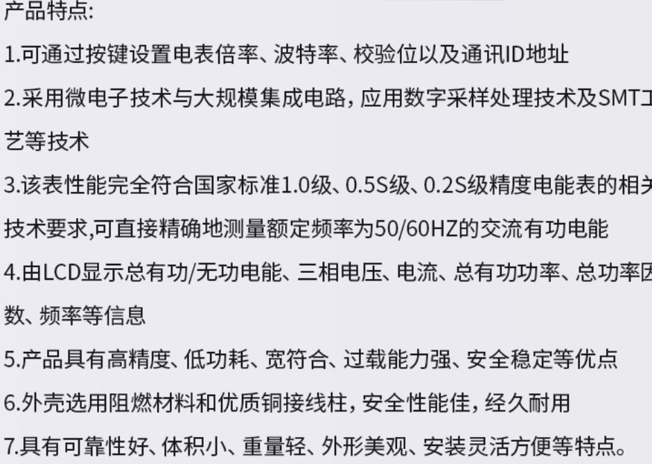 1.可通过按键设置电表倍率、波特率、校验位以及通讯ID地址2.采用微电子技术与大规模集成电路,应用数字采样处理技术及SMT艺等技术